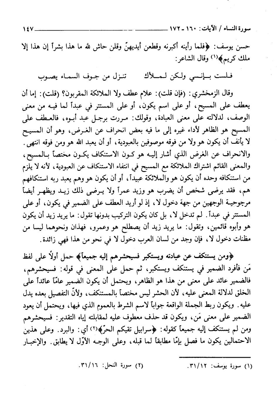 وَالِانْحِرَافُ عَنِ الْغَرَضِ الَّذِي أَشَارَ إِلَيْهِ هُوَ كَوْنُ الِاسْتِنْكَافِ يَكُونُ مُخْتَصًّا بِالْمَسِيحِ، وَالْمَعْنَى الْقَائِمُ اشْتِرَاكُ الْمَلَائِكَةِ مَعَ الْمَسِيحِ فِي انْتِفَاءِ الِاسْتِنْكَافِ عَنِ الْعُبُودِيَّةِ، لِأَنَّهُ لَا يَلْزَمُ مَنْ اسْتِنْكَافِهِ وَحْدَهُ أَنْ يَكُونَ هُوَ وَالْمَلَائِكَةُ عَبِيدًا، أَوْ أَنْ يَكُونَ هُوَ وَهُمْ يَعْبُدُ رَبَّهُ اسْتِنْكَافُهُمْ هُمْ، فَقَدْ يَرْضَى شَخْصٌ أَنْ يَضْرِبَ هُوَ وَزَيْدٌ عَمْرًا وَلَا يَرْضَى ذَلِكَ زَيْدٌ وَيَظْهَرُ أَيْضًا مَرْجُوحِيَّةُ الْوَجْهَيْنِ مِنْ جِهَةِ دُخُولِ لَا، إِذْ لَوْ أُرِيدَ الْعَطْفُ عَلَى الضَّمِيرِ فِي يَكُونَ، أَوْ عَلَى الْمُسْتَتِرِ فِي عَبْدًا. لَمْ تَدْخُلْ لَا، بَلْ كَانَ يَكُونُ التَّرْكِيبُ بِدُونِهَا تَقُولُ: مَا يُرِيدُ زَيْدٌ أَنْ يَكُونَ هُوَ وَأَبُوهُ قَائِمَيْنِ، وَتَقُولُ: مَا يُرِيدُ زَيْدٌ أَنْ يَصْطَلِحَ هُوَ وَعَمْرٌو، فَهَذَانِ وَنَحْوُهُمَا لَيْسَا مِنْ مَظِنَّاتِ دُخُولِ لَا، فَإِنْ وُجِدَ مِنْ لِسَانِ الْعَرَبِ دُخُولُ لَا فِي نَحْوٍ مِنْ هَذَا فهي زائدة.