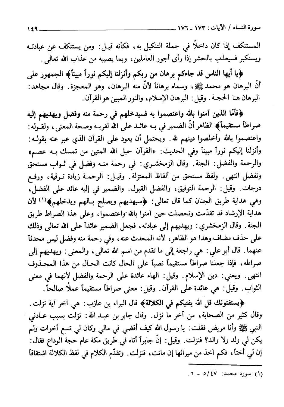 فَأَمَّا الَّذِينَ آمَنُوا بِاللَّهِ وَاعْتَصَمُوا بِهِ فَسَيُدْخِلُهُمْ فِي رَحْمَةٍ مِنْهُ وَفَضْلٍ وَيَهْدِيهِمْ إِلَيْهِ صِراطاً مُسْتَقِيماً الظَّاهِرُ أَنَّ الضَّمِيرَ فِي بِهِ عَائِدٌ عَلَى اللَّهِ لِقُرْبِهِ وَصِحَّةِ الْمَعْنَى، وَلِقَوْلِهِ: