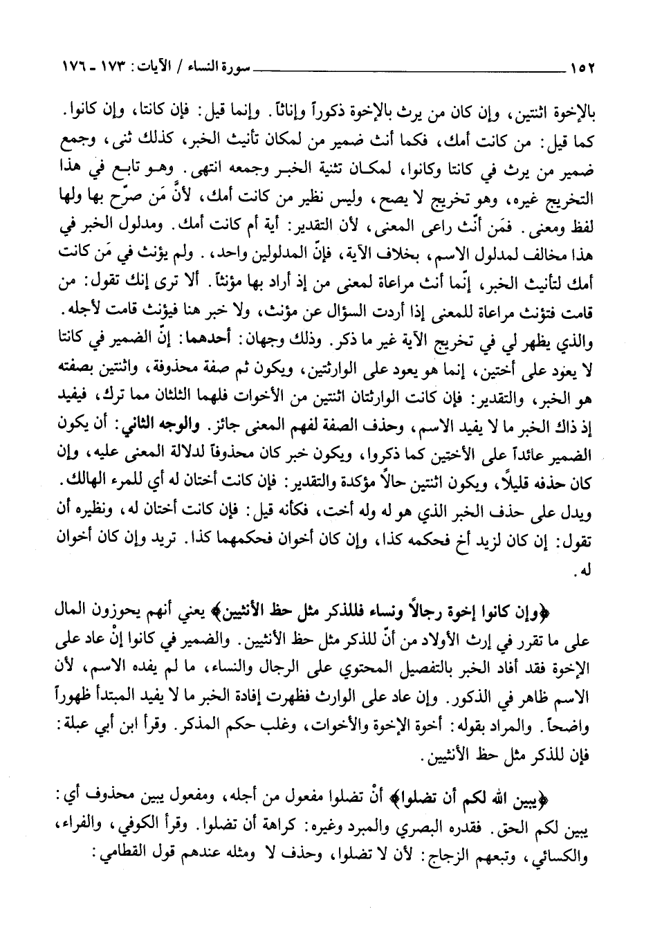وَإِنْ كانُوا إِخْوَةً رِجالًا وَنِساءً فَلِلذَّكَرِ مِثْلُ حَظِّ الْأُنْثَيَيْنِ يَعْنِي أَنَّهُمْ يَحُوزُونَ الْمَالَ عَلَى مَا تَقَرَّرَ فِي إِرْثِ الْأَوْلَادِ مِنْ أَنَّ لِلذَّكَرِ مِثْلَ حَظِّ الْأُنْثَيَيْنِ. وَالضَّمِيرُ فِي كَانُوا إِنْ عَادَ عَلَى الْإِخْوَةِ فَقَدْ أَفَادَ الْخَبَرُ بِالتَّفْصِيلِ الْمُحْتَوِي عَلَى الرِّجَالِ وَالنِّسَاءِ، مَا لَمْ يُفِدْهُ الِاسْمُ، لِأَنَّ الِاسْمَ ظَاهِرٌ فِي الذُّكُورِ. وَإِنْ عَادَ عَلَى الْوَارِثِ فَظَهَرَتْ إفادة الْخَبَرُ مَا لَا يُفِيدُ الْمُبْتَدَأُ ظُهُورًا وَاضِحًا. وَالْمُرَادُ بِقَوْلِهِ: إِخْوَةً الْإِخْوَةُ وَالْأَخَوَاتُ، وَغَلَبَ حُكْمُ الْمُذَكَّرِ. وَقَرَأَ ابْنُ أَبِي عَبْلَةَ: