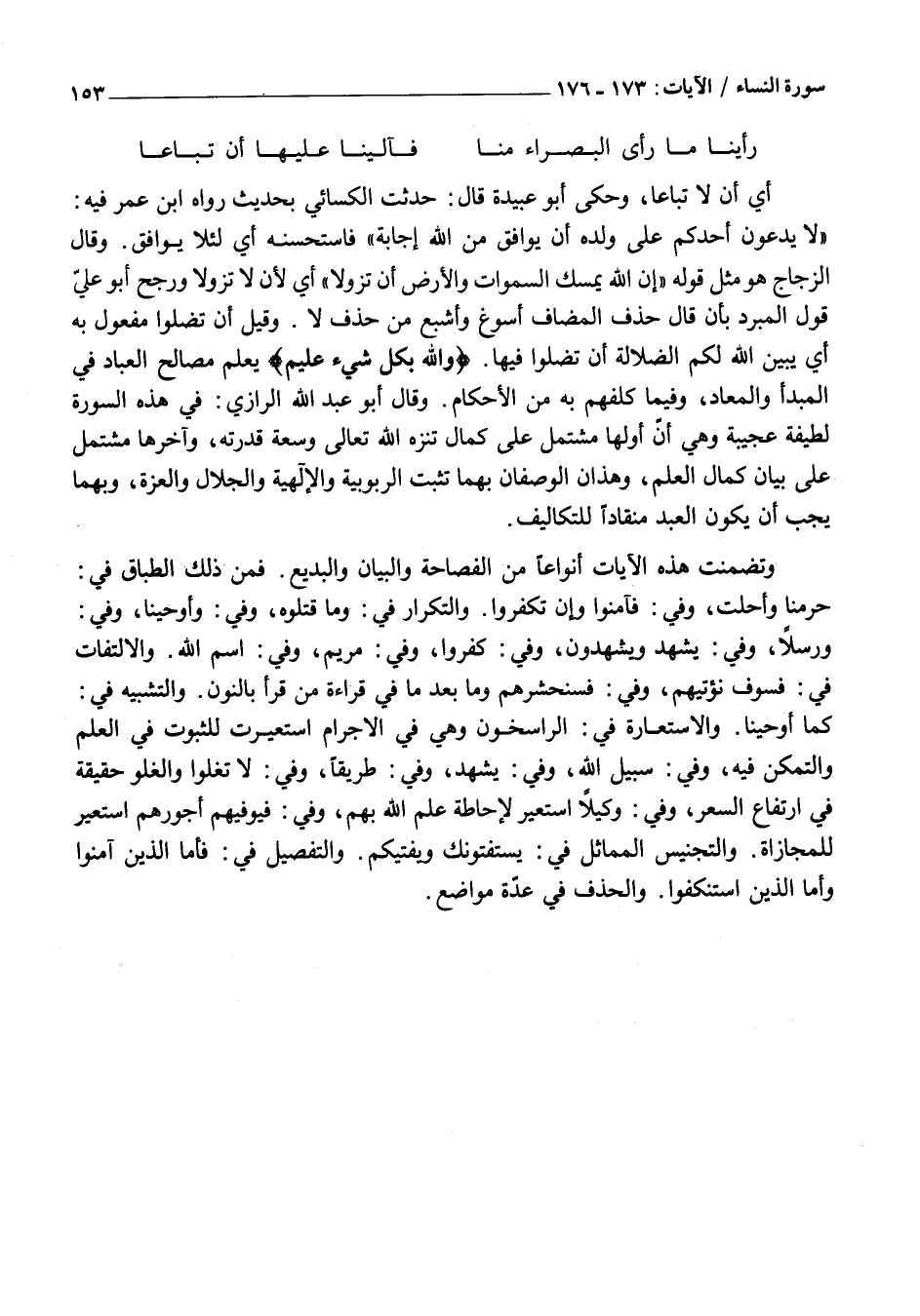 «لَا يَدْعُوَنَّ أَحَدُكُمْ عَلَى وَلَدِهِ أَنْ يُوَافِقَ مِنَ اللَّهِ إِجَابَةً» فَاسْتَحْسَنَهُ أَيْ لِئَلَّا يُوَافِقَ. وَقَالَ الزَّجَّاجُ هُوَ مِثْلُ قَوْلِهِ «إِنَّ اللَّهَ يُمْسِكُ السموات وَالْأَرْضَ أَنْ تَزُولَا» أَيْ لِأَنْ لَا تَزُولَا وَرَجَّحَ أَبُو عَلِيٍّ قَوْلَ الْمُبَرِّدِ بِأَنْ قَالَ حَذْفُ الْمُضَافِ أَسْوَغُ وَأَشْبَعُ مِنْ حَذْفِ لَا. وَقِيلَ أَنْ تَضِلُّوا مَفْعُولٌ بِهِ أَيْ يُبَيِّنُ اللَّهُ لَكُمُ الضَّلَالَةَ أَنْ تَضِلُّوا فِيهَا. وَاللَّهُ بِكُلِّ شَيْءٍ عَلِيمٌ يَعْلَمُ مَصَالِحَ الْعِبَادِ فِي الْمَبْدَأِ وَالْمَعَادِ، وَفِيمَا كَلَّفَهُمْ بِهِ مِنَ الْأَحْكَامِ. وَقَالَ أَبُو عَبْدِ اللَّهِ الرازي: في هذه السُّورَةِ لَطِيفَةٌ عَجِيبَةٌ وَهِيَ أَنَّ أَوَّلَهَا مُشْتَمِلٌ عَلَى كَمَالِ تَنَزُّهِ اللَّهِ تَعَالَى وَسَعَةِ قُدْرَتِهِ، وَآخِرُهَا مُشْتَمِلٌ عَلَى بَيَانِ كَمَالِ الْعِلْمِ، وَهَذَانِ الْوَصْفَانِ بِهِمَا تَثْبُتُ الرُّبُوبِيَّةُ وَالْإِلَهِيَّةُ وَالْجَلَالُ وَالْعِزَّةُ، وَبِهِمَا يَجِبُ أَنْ يَكُونَ الْعَبْدُ مُنْقَادًا لِلتَّكَالِيفِ.
