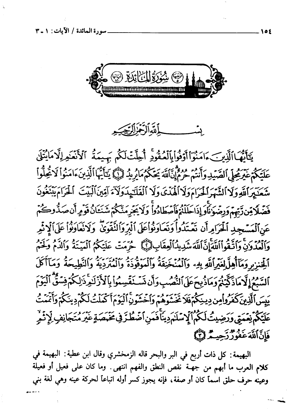 يَا أَيُّهَا الَّذِينَ آمَنُوا أَوْفُوا بِالْعُقُودِ أُحِلَّتْ لَكُمْ بَهِيمَةُ الْأَنْعامِ إِلاَّ مَا يُتْلى عَلَيْكُمْ غَيْرَ مُحِلِّي الصَّيْدِ وَأَنْتُمْ حُرُمٌ إِنَّ اللَّهَ يَحْكُمُ مَا يُرِيدُ (1) يَا أَيُّهَا الَّذِينَ آمَنُوا لَا تُحِلُّوا شَعائِرَ اللَّهِ وَلا الشَّهْرَ الْحَرامَ وَلا الْهَدْيَ وَلا الْقَلائِدَ وَلا آمِّينَ الْبَيْتَ الْحَرامَ يَبْتَغُونَ فَضْلاً مِنْ رَبِّهِمْ وَرِضْواناً وَإِذا حَلَلْتُمْ فَاصْطادُوا وَلا يَجْرِمَنَّكُمْ شَنَآنُ قَوْمٍ أَنْ صَدُّوكُمْ عَنِ الْمَسْجِدِ الْحَرامِ أَنْ تَعْتَدُوا وَتَعاوَنُوا عَلَى الْبِرِّ وَالتَّقْوى وَلا تَعاوَنُوا عَلَى الْإِثْمِ وَالْعُدْوانِ وَاتَّقُوا اللَّهَ إِنَّ اللَّهَ شَدِيدُ الْعِقابِ (2) حُرِّمَتْ عَلَيْكُمُ الْمَيْتَةُ وَالدَّمُ وَلَحْمُ الْخِنْزِيرِ وَما أُهِلَّ لِغَيْرِ اللَّهِ بِهِ وَالْمُنْخَنِقَةُ وَالْمَوْقُوذَةُ وَالْمُتَرَدِّيَةُ وَالنَّطِيحَةُ وَما أَكَلَ السَّبُعُ إِلاَّ مَا ذَكَّيْتُمْ وَما ذُبِحَ عَلَى النُّصُبِ وَأَنْ تَسْتَقْسِمُوا بِالْأَزْلامِ ذلِكُمْ فِسْقٌ الْيَوْمَ يَئِسَ الَّذِينَ كَفَرُوا مِنْ دِينِكُمْ فَلا تَخْشَوْهُمْ وَاخْشَوْنِ الْيَوْمَ أَكْمَلْتُ لَكُمْ دِينَكُمْ وَأَتْمَمْتُ عَلَيْكُمْ نِعْمَتِي وَرَضِيتُ لَكُمُ الْإِسْلامَ دِيناً فَمَنِ اضْطُرَّ فِي مَخْمَصَةٍ غَيْرَ مُتَجانِفٍ لِإِثْمٍ فَإِنَّ اللَّهَ غَفُورٌ رَحِيمٌ (3)