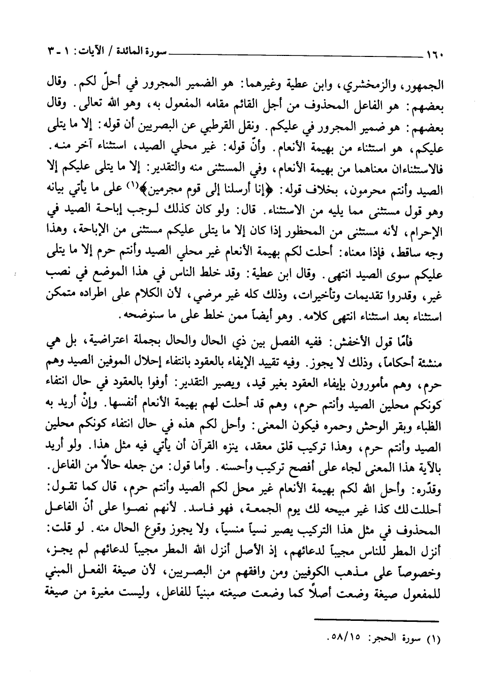 فَأَمَّا قَوْلُ الْأَخْفَشِ: فَفِيهِ الْفَصْلُ بَيْنَ ذِي الْحَالِ وَالْحَالِ بِجُمْلَةٍ اعْتِرَاضِيَّةٍ، بَلْ هِيَ مُنْشِئَةٌ أَحْكَامًا، وَذَلِكَ لَا يَجُوزُ. وَفِيهِ تَقْيِيدُ الْإِيفَاءِ بِالْعُقُودِ بِانْتِفَاءِ إِحْلَالِ الْمُوفِينَ الصَّيْدَ وَهُمْ حُرُمٌ، وَهُمْ مَأْمُورُونَ بِإِيفَاءِ الْعُقُودِ بِغَيْرِ قَيْدٍ، وَيَصِيرُ التَّقْدِيرُ: أَوْفُوا بِالْعُقُودِ فِي حَالِ انْتِفَاءِ كَوْنِكُمْ مُحَلِّينَ الصَّيْدَ وَأَنْتُمْ حُرُمٌ، وَهُمْ قَدْ أُحِلَّتْ لَهُمْ بَهِيمَةُ الْأَنْعَامِ أَنْفِسِهَا. وَإِنْ أُرِيدَ بِهِ الظِّبَاءُ وَبَقَرُ الْوَحْشِ وَحُمُرُهُ فَيَكُونَ الْمَعْنَى: وَأُحِلَّ لَكُمْ هَذِهِ فِي حَالِ انْتِفَاءِ كَوْنِكُمْ محلين الصيد وأنتم حرم، وَهَذَا تَرْكِيبٌ قَلِقٌ مُعَقَّدٌ، يُنَزَّهُ الْقُرْآنُ أَنْ يَأْتِيَ فِيهِ مِثْلُ هَذَا. وَلَوْ أُرِيدَ بِالْآيَةِ هَذَا الْمَعْنَى لَجَاءَ عَلَى أَفْصَحِ تَرْكِيبٍ وَأَحْسَنِهِ. وَأَمَّا قَوْلُ: مَنْ جَعَلَهُ حَالًا مِنَ الْفَاعِلِ.