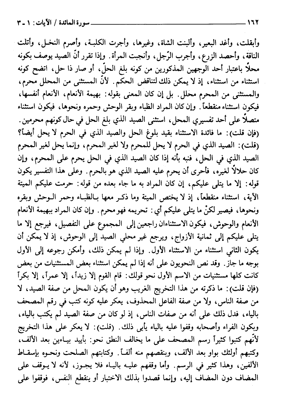 (قُلْتُ) : الصَّيْدُ الَّذِي فِي الْحَرَمِ لَا يَحِلُّ لِلْمُحْرِمِ وَلَا لِغَيْرِ الْمُحْرِمِ، وَإِنَّمَا يَحِلُّ لِغَيْرِ الْمُحْرِمِ الصَّيْدُ الَّذِي فِي الْحِلِّ، فَنَبَّهَ بِأَنَّهُ إِذَا كَانَ الصَّيْدُ الَّذِي فِي الْحِلِّ يَحْرُمُ عَلَى الْمُحْرِمِ، وَإِنْ كَانَ حَلَالًا لِغَيْرِهِ، فَأَحْرَى أَنْ يَحْرُمَ عَلَيْهِ الصَّيْدُ الَّذِي هُوَ بِالْحَرَمِ. وَعَلَى هَذَا التَّفْسِيرِ يَكُونُ قَوْلُهُ: إِلَّا مَا يُتْلَى عَلَيْكُمْ، إِنْ كَانَ الْمُرَادُ بِهِ مَا جَاءَ بَعْدَهُ مِنَ قوله: حرمت عليكم الميتة الْآيَةَ، اسْتِثْنَاءً مُنْقَطِعًا، إِذْ لَا يَخْتَصُّ الْمَيْتَةَ وَمَا ذُكِرَ مَعَهَا بِالظِّبَاءِ وَحُمُرِ الْوَحْشِ وَبَقَرِهِ وَنَحْوِهَا، فَيَصِيرُ لَكِنْ مَا يُتْلَى عَلَيْكُمْ أَيْ: تَحْرِيمُهُ فَهُوَ مُحَرَّمٌ. وَإِنْ كَانَ الْمُرَادُ بِبَهِيمَةِ الْأَنْعَامِ الْأَنْعَامَ وَالْوُحُوشَ، فَيَكُونُ الِاسْتِثْنَاءَانِ رَاجِعَيْنِ إِلَى الْمَجْمُوعِ عَلَى التَّفْصِيلِ، فَيَرْجِعُ إِلَّا مَا يُتْلَى عَلَيْكُمْ إِلَى ثَمَانِيَةِ الْأَزْوَاجِ، وَيَرْجِعُ غَيْرَ مُحِلِّي الصَّيْدِ إِلَى الْوُحُوشِ، إِذْ لَا يُمْكِنُ أَنْ يَكُونَ الثَّانِي اسْتِثْنَاءً مِنَ الِاسْتِثْنَاءِ الْأَوَّلِ. وَإِذَا لَمْ يُمْكِنْ ذَلِكَ، وَأَمْكَنَ رُجُوعُهُ إِلَى الْأَوَّلِ بِوَجْهٍ مَا جَازَ. وَقَدْ نَصَّ النَّحْوِيُّونَ عَلَى أَنَّهُ إِذَا لَمْ يُمْكِنِ اسْتِثْنَاءُ بَعْضِ الْمُسْتَثْنَيَاتِ مِنْ بَعْضٍ كَانَتْ كُلُّهَا مُسْتَثْنَيَاتٍ مِنَ الِاسْمِ الْأَوَّلِ نَحْوَ قَوْلِكَ: قَامَ الْقَوْمُ إِلَّا زَيْدًا، إِلَّا عَمْرًا، إِلَّا بَكْرًا (فَإِنْ قُلْتَ) : مَا ذَكَرْتَهُ مِنْ هَذَا التَّخْرِيجِ الْغَرِيبِ وَهُوَ أَنْ يَكُونَ الْمُحِلُّ مِنْ صِفَةِ الصَّيْدِ، لَا مِنْ صِفَةِ النَّاسِ، وَلَا مِنْ صِفَةِ الْفَاعِلِ الْمَحْذُوفِ، يُعَكِّرُ عَلَيْهِ كَوْنُهُ كُتِبَ فِي رَقْمِ الْمُصْحَفِ بِالْيَاءِ، فَدَلَّ ذَلِكَ عَلَى أَنَّهُ مِنْ صِفَاتِ النَّاسِ، إِذْ لَوْ كَانَ مِنْ صِفَةِ الصَّيْدِ لَمْ يُكْتَبْ بِالْيَاءِ، وَبِكَوْنِ الْفَرَّاءِ وَأَصْحَابِهِ وَقَفُوا عَلَيْهِ بِالْيَاءِ يَأْبَى ذَلِكَ. (قُلْتُ) : لَا يُعَكِّرُ عَلَى هَذَا التَّخْرِيجِ لِأَنَّهُمْ كَتَبُوا كَثِيرًا رَسْمَ الْمُصْحَفِ عَلَى مَا يُخَالِفُ النُّطْقَ نَحْوَ: بِأَيْيدٍ بِيَاءَيْنِ بَعْدَ الْأَلِفِ، وَكَتْبُهُمْ أُولَئِكَ بِوَاوٍ بَعْدَ الْأَلِفِ، وَبِنَقْصِهِمْ مِنْهُ أَلِفًا. وَكِتَابَتُهُمُ الصَّلِحَتِ وَنَحْوِهِ بِإِسْقَاطِ الْأَلِفَيْنِ، وَهَذَا كَثِيرٌ فِي الرَّسْمِ. وَأَمَّا وَقْفُهُمْ عَلَيْهِ بِالْيَاءِ فَلَا يَجُوزُ، لِأَنَّهُ لَا يُوقَفُ عَلَى الْمُضَافِ دُونَ الْمُضَافِ إِلَيْهِ، وَإِنَّمَا قَصَدُوا بِذَلِكَ الِاخْتِبَارَ أَوْ يَنْقَطِعُ النَّفَسُ، فَوَقَفُوا عَلَى