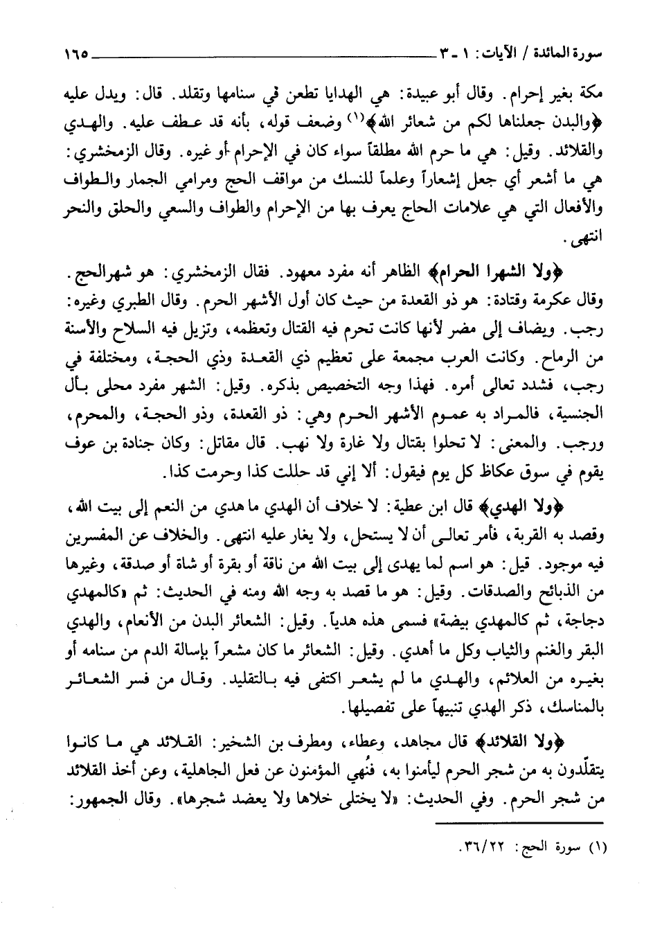 وَلَا الْهَدْيَ قَالَ ابْنُ عَطِيَّةَ: لَا خِلَافَ أَنَّ الْهَدْيَ مَا هُدِيَ مِنَ النَّعَمِ إِلَى بَيْتِ اللَّهِ، وَقُصِدَ بِهِ الْقُرْبَةُ، فَأَمَرَ تَعَالَى أَنْ لَا يُسْتَحَلَّ، وَلَا يَغَارَ عَلَيْهِ انْتَهَى. وَالْخِلَافُ عَنِ الْمُفَسِّرِينَ فِيهِ مَوْجُودٌ. قِيلَ: هُوَ اسْمٌ لِمَا يُهْدَى إِلَى بَيْتِ اللَّهِ مِنْ نَاقَةٍ أَوْ بَقَرَةٍ أَوْ شَاةٍ أَوْ صَدَقَةٍ، وَغَيْرِهَا مِنَ الذَّبَائِحِ وَالصَّدَقَاتِ. وَقِيلَ: هُوَ مَا قُصِدَ بِهِ وَجْهُ اللَّهِ وَمِنْهُ
