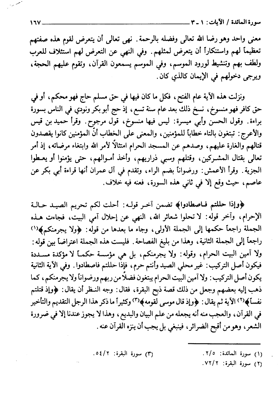 وَلَا آمِّينَ الْبَيْتَ الْحَرَامَ، وَقَوْلِهِ: وَلَا يَجْرِمَنَّكُمْ، بَلْ هِيَ مُؤَسِّسَةٌ حُكْمًا لَا مُؤَكِّدَةٌ مسددة فَيَكُونُ أَصْلُ التَّرْكِيبِ: غَيْرَ مُحِلِّي الصَّيْدِ وَأَنْتُمْ حُرُمٌ، فَإِذَا حَلَلْتُمْ فَاصْطَادُوا. وَفِي الْآيَةِ الثَّانِيَةِ يَكُونُ أَصْلُ التَّرْكِيبِ: وَلَا آمِّينَ الْبَيْتَ الْحَرَامَ يَبْتَغُونَ فَضْلًا مِنْ ربهم ورضوانا ولا يجر منكم، كَمَا ذَهَبَ إِلَيْهِ بَعْضُهُمْ وَجَعَلَ مِنْ ذَلِكَ قِصَّةَ ذَبْحِ الْبَقَرَةِ، فَقَالَ: وَجْهُ النَّظَرِ أَنْ يُقَالَ: وَإِذْ قَتَلْتُمْ نَفْساً «2» الْآيَةَ ثُمَّ يُقَالُ: وَإِذْ قالَ مُوسى لِقَوْمِهِ «3» وَكَثِيرًا مَا ذَكَرَ هَذَا الرَّجُلُ التَّقْدِيمَ وَالتَّأْخِيرَ فِي الْقُرْآنِ، وَالْعَجَبُ مِنْهُ أَنَّهُ يَجْعَلُهُ مِنْ عِلْمِ الْبَيَانِ وَالْبَدِيعِ، وَهَذَا لَا يَجُوزُ عِنْدَنَا إِلَّا فِي ضَرُورَةِ الشِّعْرِ، وَهُوَ مِنْ أَقْبَحِ الضَّرَائِرِ، فَيَنْبَغِي بَلْ يَجِبُ أَنْ يُنَزَّهَ الْقُرْآنُ عَنْهُ.