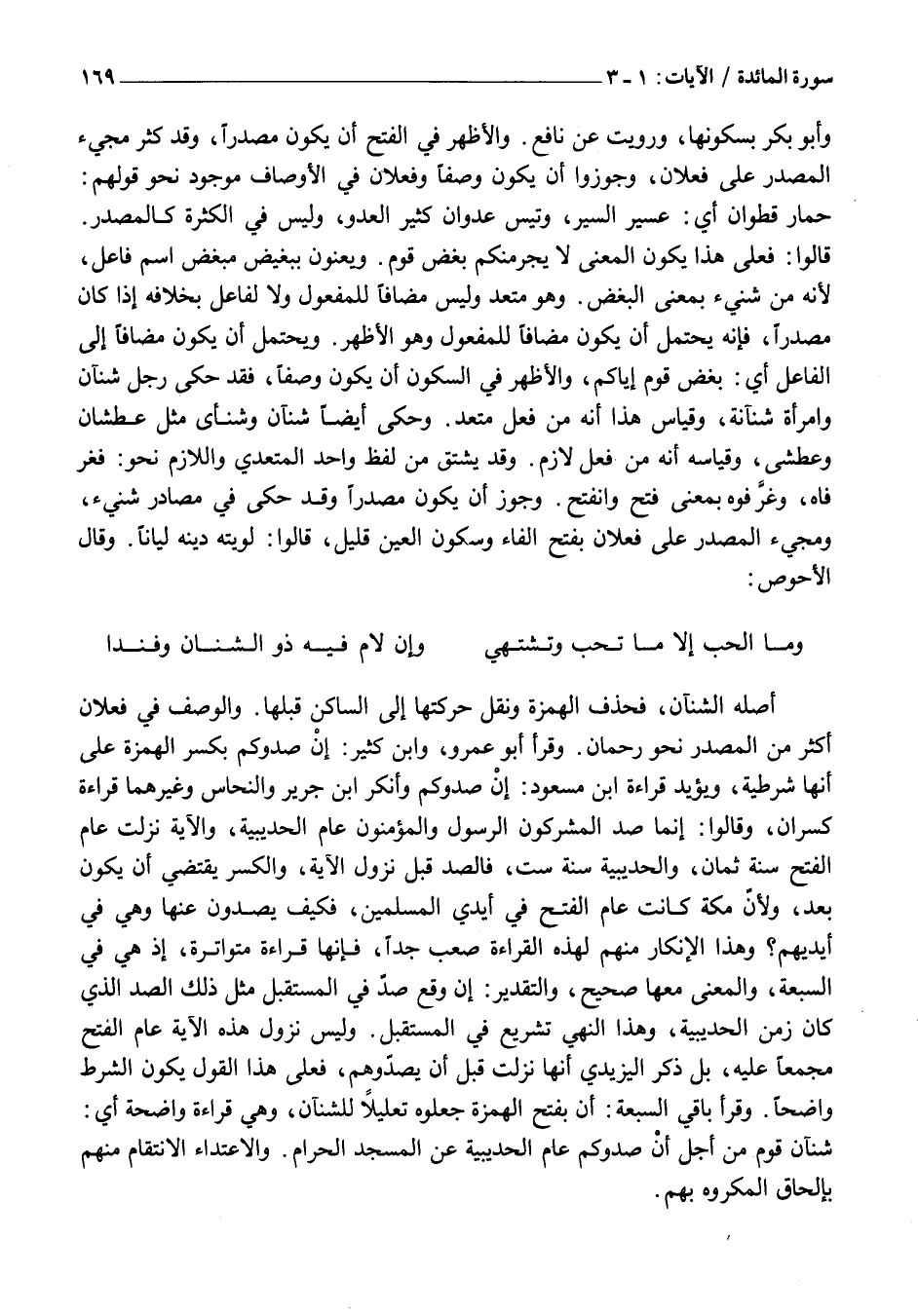 قَالُوا: فَعَلَى هَذَا يَكُونُ الْمَعْنَى لَا يَجْرِمَنَّكُمْ بُغْضُ قَوْمٍ. وَيَعْنُونَ بِبَغِيضٍ مُبْغِضٍ اسْمُ فَاعِلٍ، لِأَنَّهُ من شنيء بِمَعْنَى الْبُغْضِ. وَهُوَ مُتَعَدٍّ وَلَيْسَ مُضَافًا لِلْمَفْعُولِ وَلَا لِفَاعِلٍ بِخِلَافِهِ إِذَا كَانَ مَصْدَرًا، فَإِنَّهُ يَحْتَمِلُ أَنْ يَكُونَ مُضَافًا لِلْمَفْعُولِ وَهُوَ الْأَظْهَرُ. وَيُحْتَمَلُ أَنْ يَكُونَ مُضَافًا إِلَى الْفَاعِلِ أَيْ: بُغْضُ قَوْمٍ إِيَّاكُمْ، وَالْأَظْهَرُ فِي السُّكُونِ أَنْ يَكُونَ وَصْفًا، فَقَدْ حُكِيَ رَجُلٌ شَنْآنٌ وَامْرَأَةٌ شَنْآنَةٌ، وَقِيَاسُ هَذَا أَنَّهُ مِنْ فِعْلٍ مُتَعَدٍّ. وَحُكِيَ أَيْضًا شَنْآنُ وَشَنْأَى مِثْلُ عَطْشَانَ وَعَطْشَى، وَقِيَاسُهُ أَنَّهُ مَنْ فِعْلٍ لَازِمٍ. وَقَدْ يُشْتَقُّ مِنْ لَفْظٍ وَاحِدٍ الْمُتَعَدِّي وَاللَّازِمُ نحو: فغر فاه، وغرّفوه بِمَعْنَى فَتَحَ وَانْفَتَحَ. وَجُوِّزَ أَنْ يَكُونَ مَصْدَرًا وَقَدْ حكى في مصادر شنيء، وَمَجِيءِ الْمَصْدَرِ عَلَى فَعْلَانَ بِفَتْحِ الْفَاءِ وَسُكُونِ الْعَيْنِ قَلِيلٌ، قَالُوا: لَوَيْتُهُ دَيْنَهُ لَيَّانًا. وَقَالَ الْأَحْوَصُ: