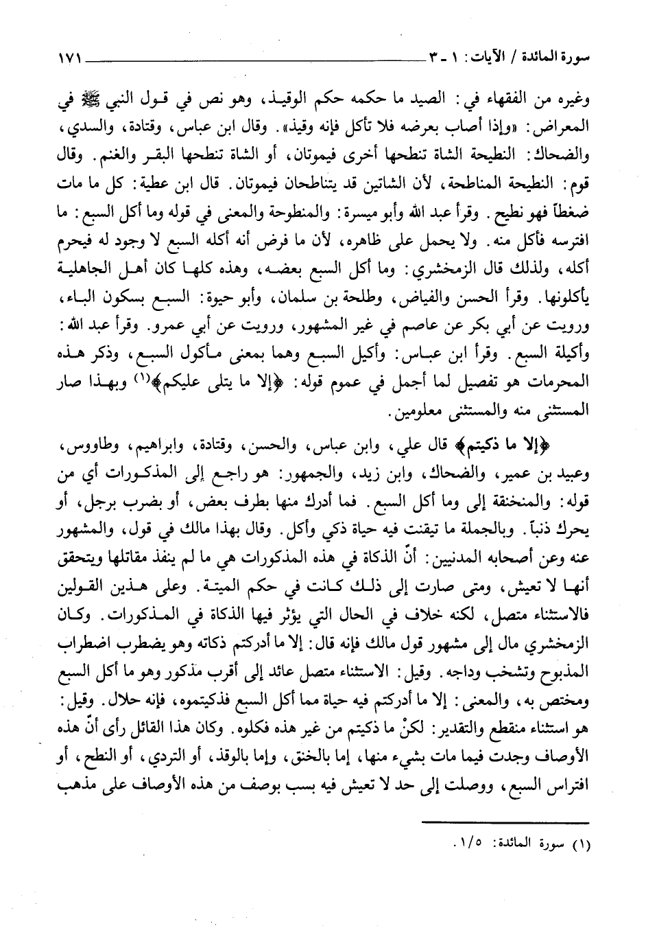أَيْ مِنْ قَوْلِهِ: وَالْمُنْخَنِقَةُ إِلَى وَمَا أَكَلَ السَّبُعُ. فَمَا أَدْرَكَ مِنْهَا بِطَرْفٍ بَعْضٌ، أو بضرب بِرِجْلٍ، أَوْ يُحَرِّكُ ذَنَبًا. وَبِالْجُمْلَةِ مَا تُيُقِّنَتْ فِيهِ حَيَاةٌ ذُكِّيَ وَأُكِلَ. وَقَالَ بِهَذَا مَالِكٌ فِي قَوْلٍ، وَالْمَشْهُورُ عَنْهُ وَعَنْ أَصْحَابِهِ الْمَدَنِيِّينَ: أَنَّ الذَّكَاةَ فِي هَذِهِ الْمَذْكُورَاتِ هِيَ مَا لَمْ يُنْفَذْ مَقَاتِلُهَا وَيُتَحَقَّقْ أَنَّهَا لَا تَعِيشُ، وَمَتَى صَارَتْ إِلَى ذَلِكَ كَانَتْ فِي حُكْمِ الْمَيْتَةِ. وَعَلَى هَذَيْنِ الْقَوْلَيْنِ فَالِاسْتِثْنَاءُ مُتَّصِلٌ، لَكِنَّهُ خِلَافٌ فِي الْحَالِ الَّتِي يُؤْثَرُ فِيهَا الذَّكَاةُ فِي الْمَذْكُورَاتِ. وَكَانَ الزَّمَخْشَرِيُّ مَالَ إِلَى مَشْهُورِ قَوْلِ مالك فإنه قال: إلا مَا أَدْرَكْتُمْ ذَكَاتَهُ وَهُوَ يَضْطَرِبُ اضْطِرَابَ الْمَذْبُوحِ وَتَشْخُبُ وِدَاجُهُ. وَقِيلَ: الِاسْتِثْنَاءُ مُتَّصِلٌ عَائِدٌ إِلَى أَقْرَبِ مَذْكُورٍ وَهُوَ مَا أَكَلَ السَّبُعُ وَمُخْتَصٌّ بِهِ، وَالْمَعْنَى: إِلَّا مَا أَدْرَكْتُمْ فِيهِ حَيَاةً مِمَّا أَكَلَ السَّبُعُ فَذَكَّيْتُمُوهُ، فَإِنَّهُ حَلَالٌ. وَقِيلَ: