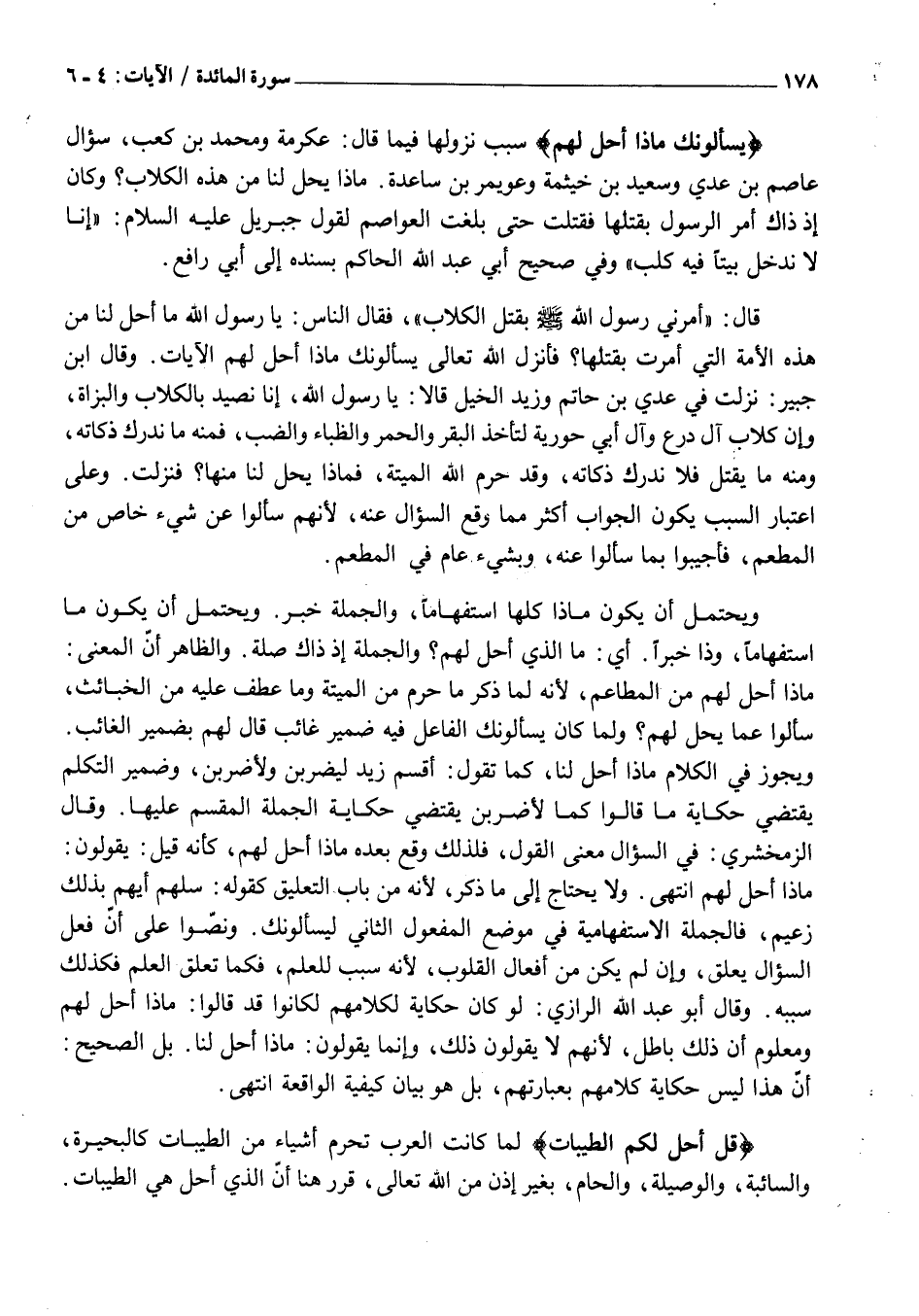 مَاذَا أُحِلَّ لَهُمْ انْتَهَى. وَلَا يُحْتَاجُ إِلَى مَا ذَكَرَ، لِأَنَّهُ مِنْ بَابِ التَّعْلِيقِ كَقَوْلِهِ: سَلْهُمْ أَيُّهُمْ بِذَلِكَ زَعِيمٌ، فَالْجُمْلَةُ الِاسْتِفْهَامِيَّةُ فِي مَوْضِعِ الْمَفْعُولِ الثَّانِي ليسألونك. وَنَصُّوا عَلَى أَنَّ فِعْلَ السُّؤَالِ يُعَلَّقُ، وَإِنْ لَمْ يَكُنْ مِنْ أَفْعَالِ الْقُلُوبِ، لِأَنَّهُ سَبَبٌ لِلْعِلْمِ، فَكَمَا تَعَلَّقَ الْعِلْمُ فَكَذَلِكَ سَبَبُهُ. وَقَالَ أَبُو عَبْدِ اللَّهِ الرَّازِيُّ: لَوْ كَانَ حِكَايَةً لِكَلَامِهِمْ لَكَانُوا قَدْ قَالُوا: مَاذَا أُحِلَّ لَهُمْ وَمَعْلُومٌ أَنَّ ذَلِكَ بَاطِلٌ، لِأَنَّهُمْ لَا يَقُولُونَ ذَلِكَ، وَإِنَّمَا يَقُولُونَ: مَاذَا أُحِلَّ لَنَا. بَلِ الصَّحِيحُ: