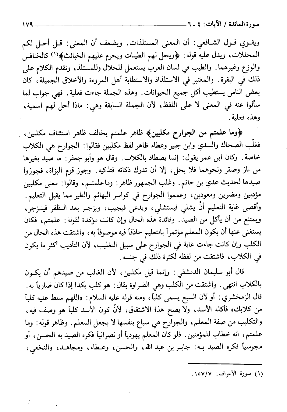 وَما عَلَّمْتُمْ مِنَ الْجَوارِحِ مُكَلِّبِينَ ظَاهِرُ عَلَّمْتُمْ يُخَالِفُ ظَاهِرَ اسْتِئْنَافِ مُكَلِّبِينَ، فَغَلَّبَ الضَّحَّاكُ وَالسُّدِّيُّ وَابْنُ جُبَيْرٍ وَعَطَاءٌ ظَاهِرَ لَفْظِ مُكَلِّبِينَ فَقَالُوا: الْجَوَارِحُ هِيَ الْكِلَابُ خَاصَّةً. وَكَانَ ابْنُ عُمَرَ يَقُولُ: إِنَّمَا يُصْطَادُ بِالْكِلَابِ. وَقَالَ هُوَ وَأَبُو جَعْفَرٍ: مَا صِيدَ بِغَيْرِهَا مِنْ بَازٍ وَصَقْرٍ وَنَحْوِهِمَا فَلَا يَحِلُّ، إِلَّا أَنْ تُدْرِكَ ذَكَاتَهُ فَتُذَكِّيَهُ. وَجَوَّزَ قَوْمٌ الْبُزَاةَ، فَجَوَّزُوا صَيْدَهَا لِحَدِيثِ عَدِيِّ بْنِ حَاتِمٍ. وَغَلَّبَ الْجُمْهُورُ ظَاهِرَ: وَمَا عَلَّمْتُمْ، وَقَالُوا: مَعْنَى مُكَلِّبِينَ مُؤَدِّبِينَ وَمُضْرِينَ وَمُعَوِّدِينَ، وَعَمَّمُوا الْجَوَارِحَ فِي كَوَاسِرِ الْبَهَائِمِ وَالطَّيْرِ مِمَّا يَقْبَلُ التَّعْلِيمَ.