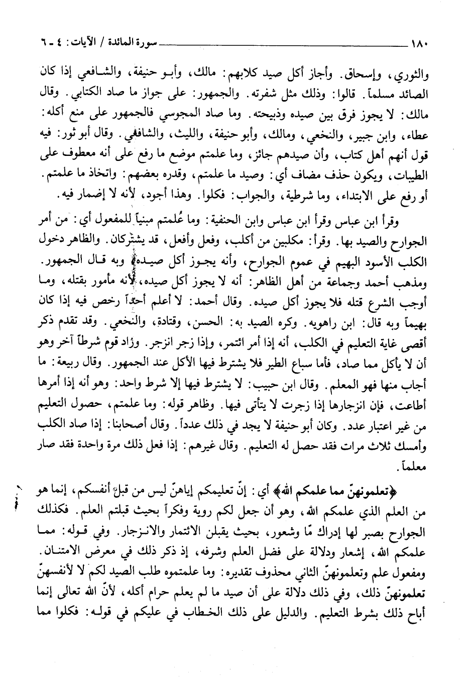 وَقَرَأَ ابْنُ عَبَّاسٍ وَقَرَأَ ابْنُ عَبَّاسٍ وَابْنُ الْحَنَفِيَّةَ: وَمَا عُلِّمْتُمْ مَبْنِيًّا لِلْمَفْعُولِ أَيْ: مِنْ أَمْرِ الْجَوَارِحِ وَالصَّيْدِ بِهَا. وَقَرَأَ: مُكْلِبِينَ مِنْ أَكْلَبَ، وَفَعَّلَ وَأَفْعَلَ، قَدْ يَشْتَرِكَانِ. وَالظَّاهِرُ دُخُولُ الْكَلْبِ الْأَسْوَدِ الْبَهِيمِ فِي عُمُومِ الْجَوَارِحِ، وَأَنَّهُ يَجُوزُ أَكْلُ صَيْدِهِ، وَبِهِ قَالَ الْجُمْهُورُ.