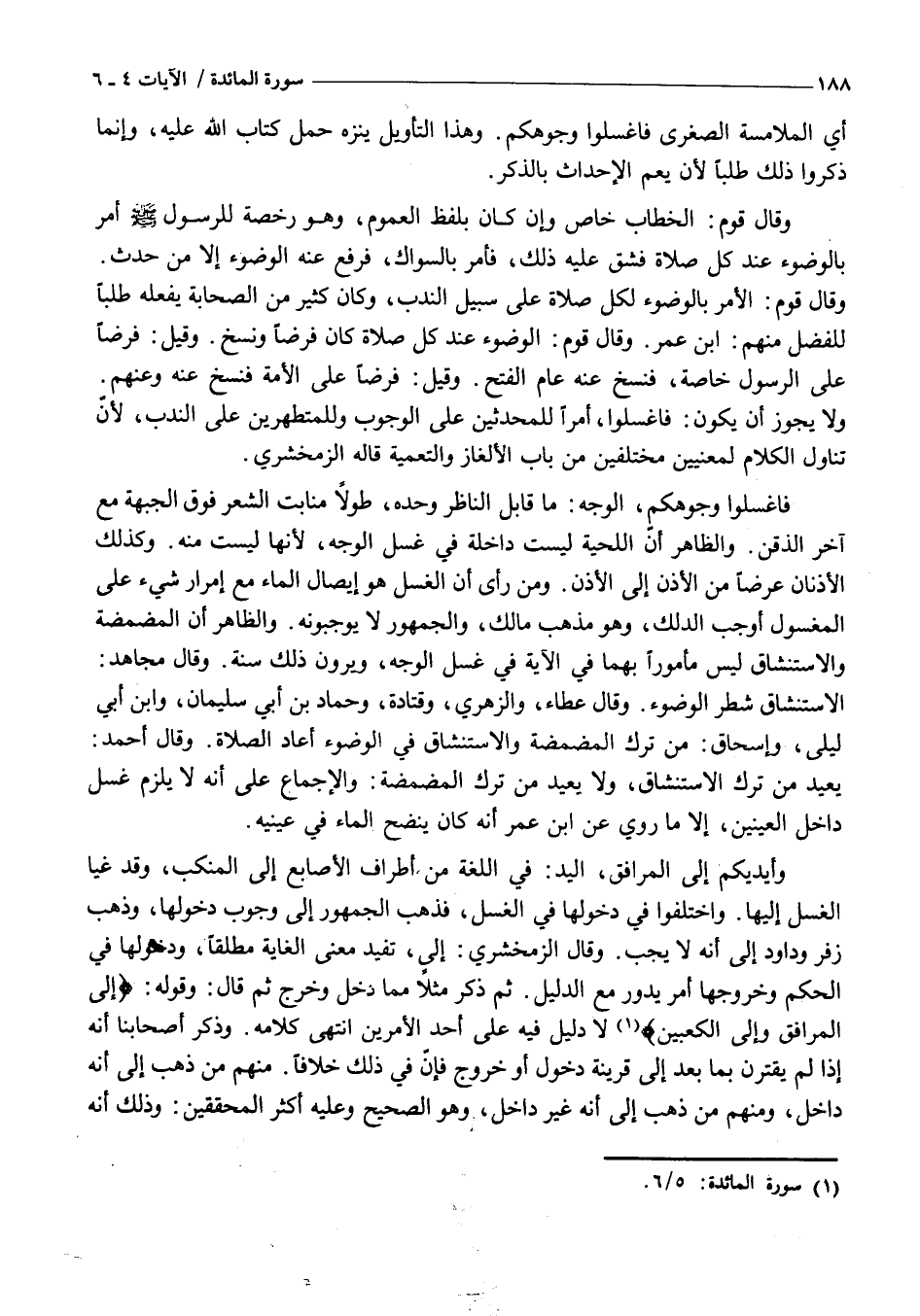 فَاغْسِلُوا وُجُوهَكُمْ، الْوَجْهُ: مَا قَابَلَ النَّاظِرَ وَحَدُّهُ، طُولًا مَنَابِتُ الشَّعْرِ فَوْقَ الْجَبْهَةِ مَعَ آخِرِ الذَّقْنِ. وَالظَّاهِرُ أَنَّ اللِّحْيَةَ لَيْسَتْ دَاخِلَةً فِي غَسْلِ الْوَجْهِ، لِأَنَّهَا لَيْسَتْ مِنْهُ. وَكَذَلِكَ الْأُذُنَانِ عَرْضًا مِنَ الْأُذُنِ إِلَى الْأُذُنِ. وَمَنْ رَأَى أَنَّ الْغَسْلَ هُوَ إِيصَالُ الْمَاءِ مَعَ إِمْرَارِ شَيْءٍ عَلَى الْمَغْسُولِ أَوْجَبَ الدَّلْكَ، وَهُوَ مَذْهَبُ مَالِكٍ، وَالْجُمْهُورُ لَا يُوجِبُونَهُ. وَالظَّاهِرُ أَنَّ الْمَضْمَضَةَ وَالِاسْتِنْشَاقَ لَيْسَ مَأْمُورًا بِهِمَا فِي الْآيَةِ فِي غَسْلِ الْوَجْهِ، وَيَرَوْنَ ذَلِكَ سُنَّةً. وَقَالَ مُجَاهِدٌ: