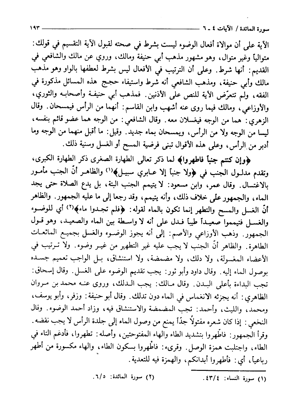 مُتَوَالِيًا وَغَيْرَ مُتَوَالٍ، وَهُوَ مَشْهُورُ مَذْهَبِ أَبِي حَنِيفَةَ وَمَالِكٍ، وَرُوِيَ عَنْ مَالِكٍ وَالشَّافِعِيِّ فِي الْقَدِيمِ: أَنَّهَا شَرْطٌ. وَعَلَى أَنَّ التَّرْتِيبَ فِي الْأَفْعَالِ لَيْسَ بِشَرْطٍ لِعَطْفِهَا بِالْوَاوِ وَهُوَ مَذْهَبُ مَالِكٍ وَأَبِي حَنِيفَةَ، وَمَذْهَبُ الشَّافِعِيِّ أَنَّهُ شَرْطٌ وَاسْتِيفَاءُ حُجَجِ هَذِهِ الْمَسَائِلِ مَذْكُورَةٌ فِي الْفِقْهِ، وَلَمْ تَتَعَرَّضِ الْآيَةُ لِلنَّصِّ عَلَى الْأُذُنَيْنِ. فَمَذْهَبُ أَبِي حَنِيفَةَ وَأَصْحَابِهِ وَالثَّوْرِيِّ، وَالْأَوْزَاعِيِّ، وَمَالِكٍ فِيمَا رَوَى عَنْهُ أَشْهَبُ وَابْنُ الْقَاسِمِ: أَنَّهُمَا مِنَ الرَّأْسِ فَيُمْسَحَانِ. وَقَالَ الزُّهْرِيُّ: هُمَا مِنَ الْوَجْهِ فَيُغْسَلَانِ مَعَهُ. وَقَالَ الشَّافِعِيُّ: مِنَ الْوَجْهِ هُمَا عُضْوٌ قَائِمٌ بِنَفْسِهِ، لَيْسَا مِنَ الْوَجْهِ وَلَا مِنَ الرَّأْسِ، وَيُمْسَحَانِ بِمَاءٍ جَدِيدٍ. وَقِيلَ: مَا أَقْبَلَ مِنْهُمَا مِنَ الْوَجْهِ وَمَا أَدْبَرَ مِنَ الرَّأْسِ، وَعَلَى هَذِهِ الْأَقْوَالِ تُبْنَى فَرْضِيَّةُ الْمَسْحِ أَوِ الْغَسْلِ وَسُنِّيَّةُ ذَلِكَ.