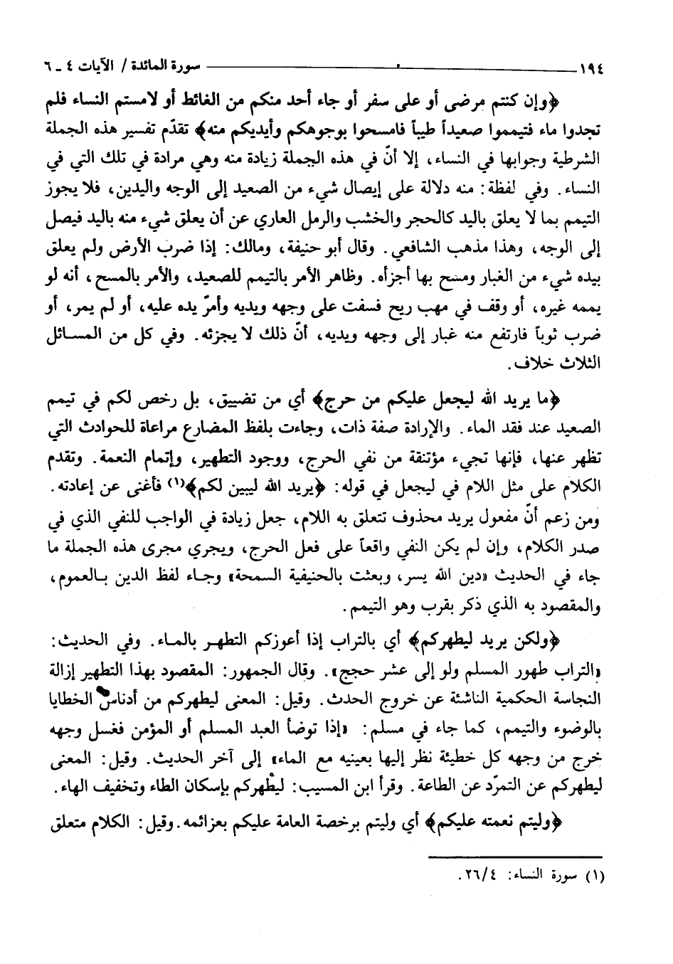 وَإِنْ كُنْتُمْ مَرْضى أَوْ عَلى سَفَرٍ أَوْ جاءَ أَحَدٌ مِنْكُمْ مِنَ الْغائِطِ أَوْ لامَسْتُمُ النِّساءَ فَلَمْ تَجِدُوا مَاءً فَتَيَمَّمُوا صَعِيداً طَيِّباً فَامْسَحُوا بِوُجُوهِكُمْ وَأَيْدِيكُمْ مِنْهُ تَقَدَّمَ تَفْسِيرُ هَذِهِ الْجُمْلَةِ الشَّرْطِيَّةِ وَجَوَابِهَا فِي النِّسَاءِ، إِلَّا أَنَّ فِي هَذِهِ الْجُمْلَةِ زِيَادَةَ مِنْهُ وَهِيَ مُرَادَةٌ فِي تِلْكَ الَّتِي فِي النِّسَاءِ. وَفِي لَفْظَةِ: مِنْهُ دَلَالَةٌ عَلَى إِيصَالِ شَيْءٍ مِنَ الصَّعِيدِ إِلَى الْوَجْهِ وَالْيَدَيْنِ، فَلَا يَجُوزُ التَّيَمُّمُ بِمَا لَا يَعْلَقُ بِالْيَدِ كَالْحَجَرِ وَالْخَشَبِ وَالرَّمْلِ الْعَارِي عَنْ أَنْ يَعْلَقَ شَيْءٌ مِنْهُ بِالْيَدِ فَيَصِلَ إِلَى الْوَجْهِ، وَهَذَا مَذْهَبُ الشَّافِعِيِّ. وَقَالَ أَبُو حَنِيفَةَ، وَمَالِكٌ: إِذَا ضَرَبَ الْأَرْضَ وَلَمْ يَعْلَقْ بِيَدِهِ شَيْءٌ مِنَ الْغُبَارِ وَمَسَحَ بِهَا أَجْزَأَهُ. وَظَاهِرُ الْأَمْرِ بِالتَّيَمُّمِ لِلصَّعِيدِ، وَالْأَمْرِ بِالْمَسْحِ، أَنَّهُ لَوْ يَمَّمَهُ غَيْرُهُ، أَوْ وَقَفَ فِي مَهَبِّ رِيحٍ فَسَفَتْ عَلَى وَجْهِهِ وَيَدَيْهِ وَأَمَرَّ يَدَهُ عَلَيْهِ، أَوْ لَمْ يُمِرَّ، أَوْ ضَرَبَ ثَوْبًا فَارْتَفَعَ مِنْهُ غُبَارٌ إِلَى وَجْهِهِ وَيَدَيْهِ، أَنَّ ذَلِكَ لَا يُجْزِئُهُ. وَفِي كُلٍّ مِنَ الْمَسَائِلِ الثَّلَاثِ خِلَافٌ.