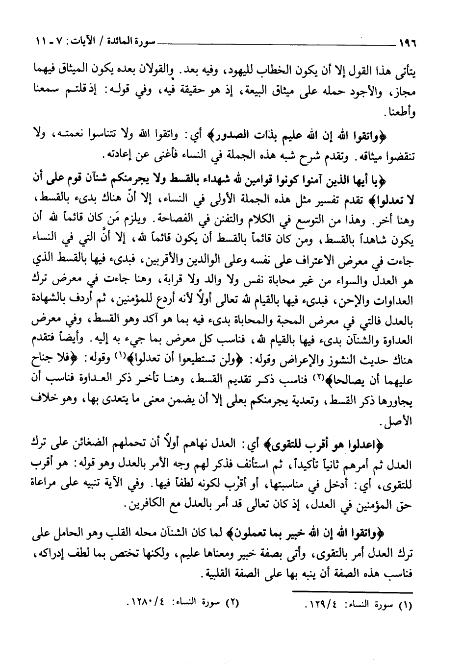 يَا أَيُّهَا الَّذِينَ آمَنُوا كُونُوا قَوَّامِينَ لِلَّهِ شُهَداءَ بِالْقِسْطِ وَلا يَجْرِمَنَّكُمْ شَنَآنُ قَوْمٍ عَلى أَلَّا تَعْدِلُوا تَقَدَّمَ تَفْسِيرُ مِثْلِ هَذِهِ الْجُمْلَةِ الْأُولَى فِي النِّسَاءِ، إِلَّا أَنَّ هُنَاكَ بُدِئَ بِالْقِسْطِ، وَهُنَا أُخِّرَ. وَهَذَا مِنَ التَّوَسُّعِ فِي الْكَلَامِ وَالتَّفَنُّنِ فِي الْفَصَاحَةِ. وَيَلْزَمُ مَنْ كَانَ قَائِمًا لِلَّهِ أَنْ يَكُونَ شَاهِدًا بِالْقِسْطِ، وَمَنْ كَانَ قَائِمًا بِالْقِسْطِ أَنْ يَكُونَ قَائِمًا لِلَّهِ، إِلَّا أَنَّ الَّتِي فِي النِّسَاءِ جَاءَتْ فِي مَعْرِضِ الِاعْتِرَافِ عَلَى نَفْسِهِ وَعَلَى الْوَالِدَيْنِ وَالْأَقْرَبِينَ، فَبُدِئَ فِيهَا بِالْقِسْطِ الَّذِي هُوَ الْعَدْلُ وَالسَّوَاءِ مِنْ غَيْرِ مُحَابَاةِ نَفْسٍ وَلَا وَالِدٍ وَلَا قَرَابَةٍ، وَهُنَا جَاءَتْ فِي مَعْرِضِ تَرْكِ الْعَدَاوَاتِ وَالْإِحَنِ، فَبُدِئَ فِيهَا بِالْقِيَامِ لِلَّهِ تَعَالَى أَوَّلًا لِأَنَّهُ أَرْدَعُ لِلْمُؤْمِنِينَ، ثُمَّ أَرْدَفَ بِالشَّهَادَةِ بِالْعَدْلِ فَالَّتِي فِي مَعْرِضِ الْمَحَبَّةِ وَالْمُحَابَاةِ بُدِئَ فِيهِ بِمَا هُوَ آكَدُ وَهُوَ الْقِسْطُ، وَفِي مَعْرِضِ الْعَدَاوَةِ وَالشَّنَآنِ بُدِئَ فِيهَا بِالْقِيَامِ لِلَّهِ، فَنَاسَبَ كُلَّ مَعْرِضٍ بِمَا جِيءَ بِهِ إِلَيْهِ. وَأَيْضًا فَتَقَدَّمَ هُنَاكَ حَدِيثُ النُّشُوزِ وَالْإِعْرَاضِ وَقَوْلُهُ: وَلَنْ تَسْتَطِيعُوا أَنْ تَعْدِلُوا «1» وَقَوْلُهُ: فَلا جُناحَ عَلَيْهِما أَنْ يُصْلِحا «2» فَنَاسَبَ ذِكْرَ تَقْدِيمِ الْقِسْطِ، وَهُنَا تَأَخَّرَ ذِكْرُ الْعَدَاوَةِ فَنَاسَبَ أَنْ يُجَاوِرَهَا ذِكْرُ الْقِسْطِ، وَتَعْدِيَةُ يجرمنكم بعلى إِلَّا أَنْ يُضَمَّنَ مَعْنَى مَا يَتَعَدَّى بِهَا، وَهُوَ خِلَافُ الْأَصْلِ.