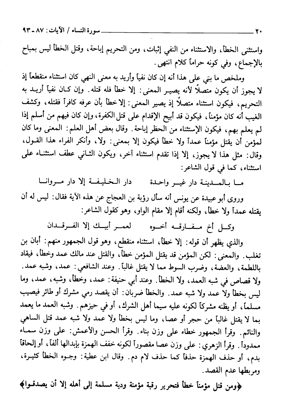 وَمُلَخَّصُ مَا بُنِيَ عَلَى هَذَا أَنَّهُ إِنْ كَانَ نَفْيًا وَأُرِيدَ بِهِ مَعْنَى النَّهْيِ كَانَ اسْتِثْنَاءً مُنْقَطِعًا إِذْ لَا يَجُوزُ أَنْ يَكُونَ مُتَّصِلًا لِأَنَّهُ يَصِيرُ الْمَعْنَى: إِلَّا خَطَأً فَلَهُ قَتْلُهُ. وَإِنْ كَانَ نَفْيًا أُرِيدَ بِهِ التَّحْرِيمُ، فَيَكُونُ اسْتِثْنَاءً مُتَّصِلًا إِذْ يَصِيرُ الْمَعْنَى: إِلَّا خَطَأً بِأَنْ عَرَفَهُ كَافِرًا فَقَتَلَهُ، وَكَشَفَ الْغَيْبُ أَنَّهُ كَانَ مُؤْمِنًا، فَيَكُونُ قَدْ أُبِيحَ الْإِقْدَامُ عَلَى قَتْلِ الْكَفَرَةِ، وَإِنْ كَانَ فِيهِمْ مَنْ أَسْلَمَ إِذَا لَمْ يَعْلَمْ بِهِمْ، فَيَكُونُ الِاسْتِثْنَاءُ مِنَ الْحَظْرِ إِبَاحَةً. وَقَالَ بَعْضُ أَهْلِ الْعِلْمِ: الْمَعْنَى وَمَا كَانَ لِمُؤْمِنٍ أَنْ يَقْتُلَ مُؤْمِنًا عَمْدًا وَلَا خَطَأً فَيَكُونُ إِلَّا بِمَعْنَى: وَلَا، وَأَنْكَرَ الْفَرَّاءُ هَذَا الْقَوْلَ، وَقَالَ: مِثْلُ هَذَا لَا يَجُوزُ، إِلَّا إِذَا تَقَدَّمَ اسْتِثْنَاءٌ آخَرُ، وَيَكُونُ الثَّانِي عَطْفَ اسْتِثْنَاءٍ عَلَى اسْتِثْنَاءٍ، كَمَا فِي قَوْلِ الشَّاعِرِ: