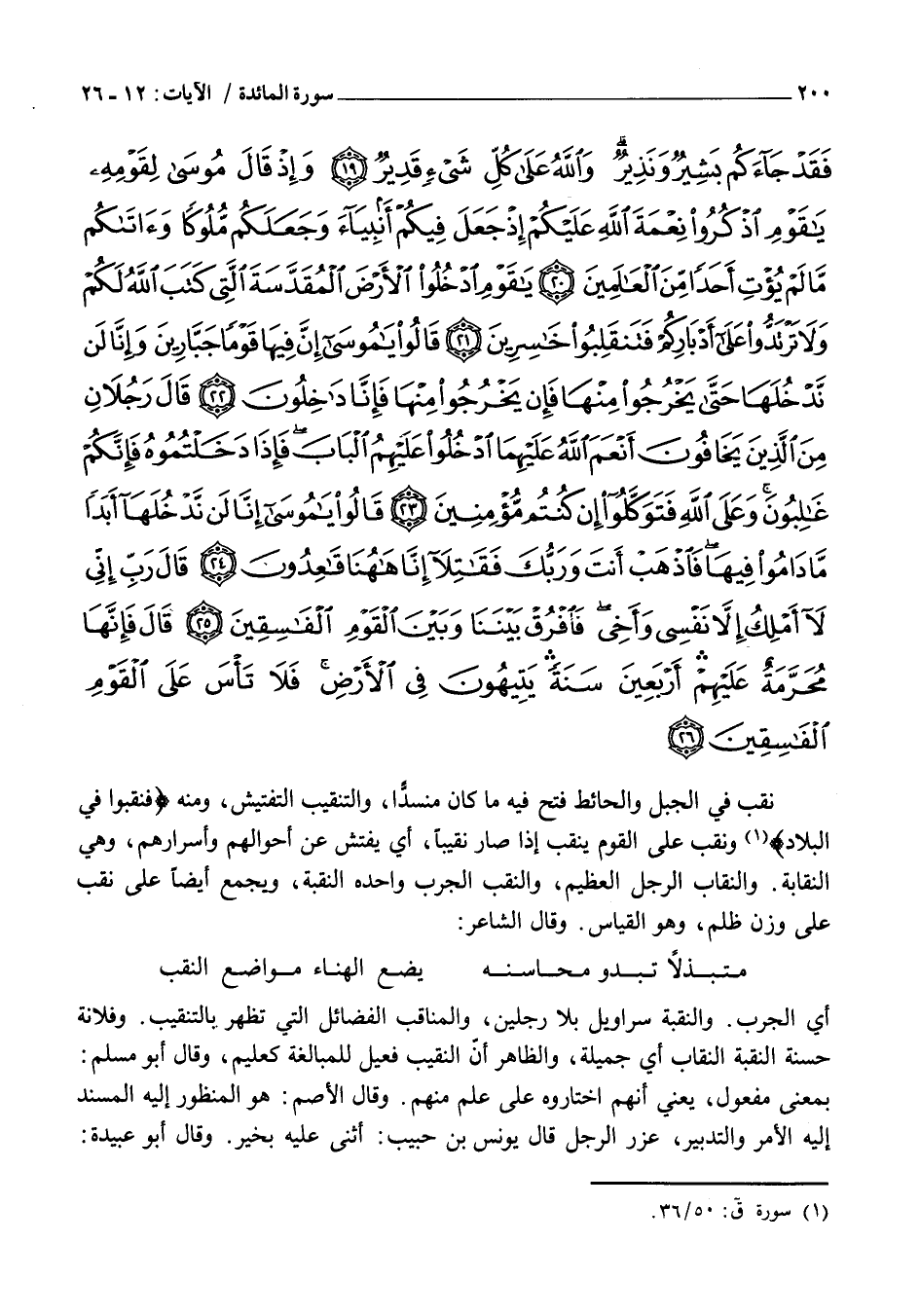 أَيِ الْجَرَبِ. وَالنُّقْبَةُ سَرَاوِيلُ بِلَا رِجْلَيْنِ، وَالْمَنَاقِبُ الْفَضَائِلُ الَّتِي تَظْهَرُ بِالتَّنْقِيبِ. وَفُلَانَةٌ حَسَنَةُ النُّقْبَةِ النقاب أَيْ جَمِيلَةٌ، وَالظَّاهِرُ أَنَّ النَّقِيبَ فَعِيلٌ لِلْمُبَالَغَةِ كَعَلِيمٍ، وَقَالَ أَبُو مُسْلِمٍ: