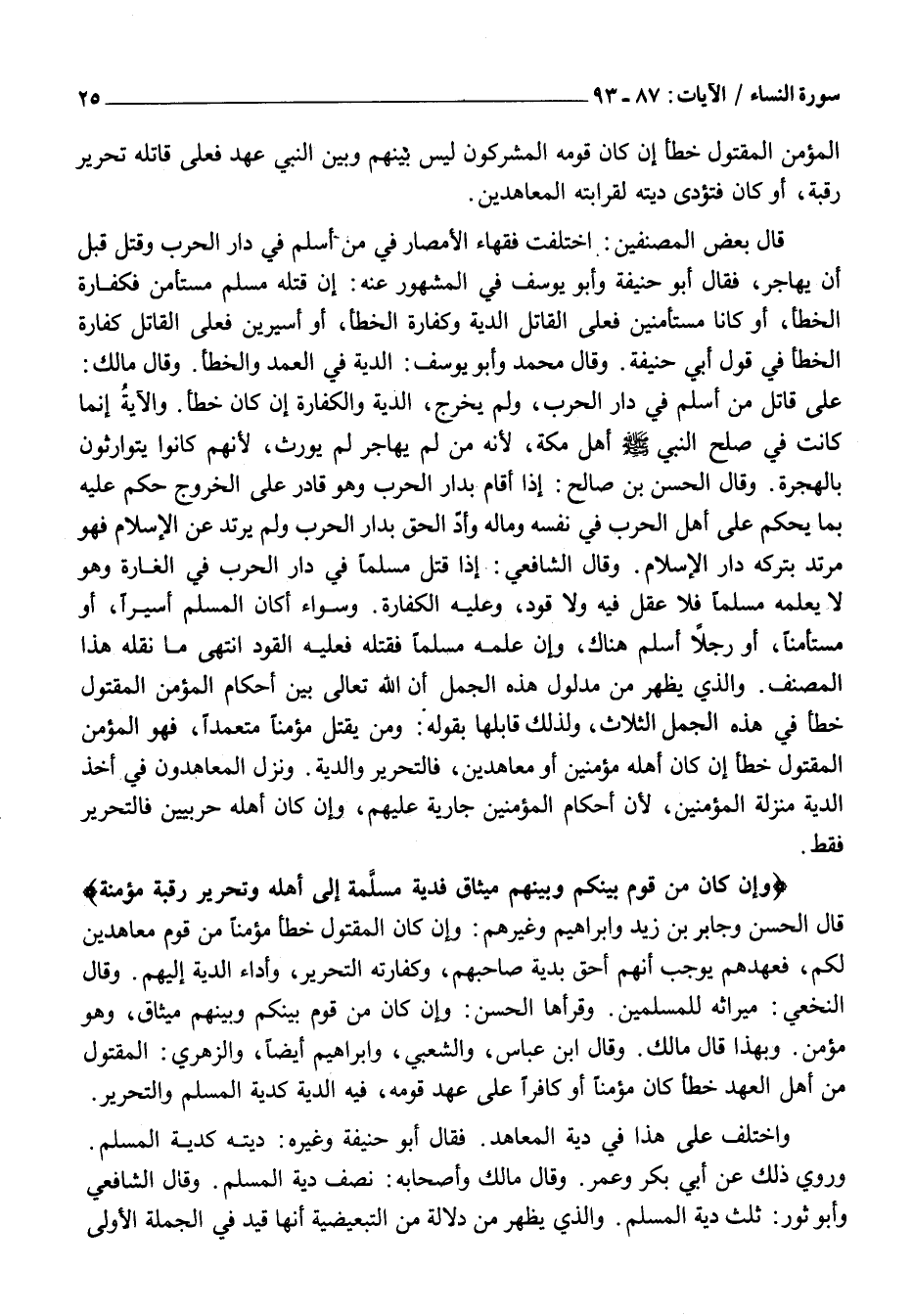 وَإِنْ كانَ مِنْ قَوْمٍ بَيْنَكُمْ وَبَيْنَهُمْ مِيثاقٌ فَدِيَةٌ مُسَلَّمَةٌ إِلى أَهْلِهِ وَتَحْرِيرُ رَقَبَةٍ مُؤْمِنَةٍ قَالَ الْحَسَنُ وَجَابِرُ بْنُ زَيْدٍ وَإِبْرَاهِيمُ وَغَيْرُهُمْ: وَإِنْ كَانَ الْمَقْتُولُ خَطَأً مُؤْمِنًا مِنْ قَوْمٍ مُعَاهَدِينَ لَكُمْ، فَعَهْدُهُمْ يُوجِبُ أَنَّهُمْ أَحَقُّ بِدِيَةِ صَاحِبِهِمْ، وَكَفَّارَتُهُ التَّحْرِيرُ، وَأَدَاءُ الدِّيَةِ إِلَيْهِمْ. وَقَالَ النَّخَعِيُّ: مِيرَاثُهُ لِلْمُسْلِمِينَ. وَقَرَأَهَا الْحَسَنُ: وَإِنْ كَانَ مِنْ قَوْمٍ بَيْنَكُمْ وَبَيْنَهُمْ مِيثَاقٌ، وَهُوَ مُؤْمِنٌ. وَبِهَذَا قَالَ مَالِكٍ. وَقَالَ ابْنُ عَبَّاسٍ، وَالشَّعْبِيُّ، وَإِبْرَاهِيمُ أَيْضًا، وَالزُّهْرِيُّ: الْمَقْتُولُ مِنْ أَهْلِ الْعَهْدِ خَطَأً كَانَ مُؤْمِنًا أَوْ كَافِرًا عَلَى عَهْدِ قَوْمِهِ، فِيهِ الدِّيَةُ كَدِيَةِ الْمُسْلِمِ وَالتَّحْرِيرُ.