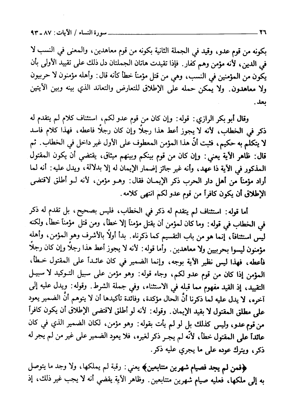 وَقَالَ أَبُو بَكْرٍ الرَّازِيُّ: قَوْلُهُ: وَإِنْ كَانَ مِنْ قَوْمٍ عَدُوٍّ لَكُمُ، اسْتِئْنَافُ كَلَامٍ لَمْ يَتَقَدَّمْ لَهُ ذِكْرٌ فِي الْخِطَابِ، لِأَنَّهُ لَا يَجُوزُ أَعْطِ هَذَا رَجُلًا وَإِنْ كَانَ رَجُلًا فَأَعْطِهِ، فَهَذَا كَلَامٌ فَاسِدٌ لَا يَتَكَلَّمُ بِهِ حَكِيمٌ، فَثَبَتَ أَنَّ هَذَا الْمُؤْمِنَ الْمَعْطُوفَ عَلَى الْأَوَّلِ غَيْرُ دَاخِلٍ فِي الْخِطَابِ. ثُمَّ قَالَ: ظَاهِرُ الْآيَةِ يَعْنِي: وَإِنْ كَانَ مِنْ قَوْمٍ بَيْنَكُمْ وَبَيْنَهُمْ مِيثَاقٌ، يَقْتَضِي أَنْ يَكُونَ الْمَقْتُولُ الْمَذْكُورُ فِي الْآيَةِ ذَا عَهْدٍ، وَأَنَّهُ غَيْرُ جَائِزٍ إِضْمَارُ الْإِيمَانِ لَهُ إِلَّا بِدَلَالَةٍ، وَيَدُلُّ عَلَيْهِ: أَنَّهُ لَمَّا أَرَادَ مُؤْمِنًا مِنْ أَهْلِ دَارِ الْحَرْبِ ذَكَرَ الْإِيمَانَ فَقَالَ: وَهُوَ مُؤْمِنٌ، لِأَنَّهُ لَوْ أَطْلَقَ لَاقْتَضَى الْإِطْلَاقُ أَنْ يَكُونَ كَافِرًا مِنْ قَوْمٍ عَدُوٍّ لَكُمْ انْتَهَى كَلَامُهُ.