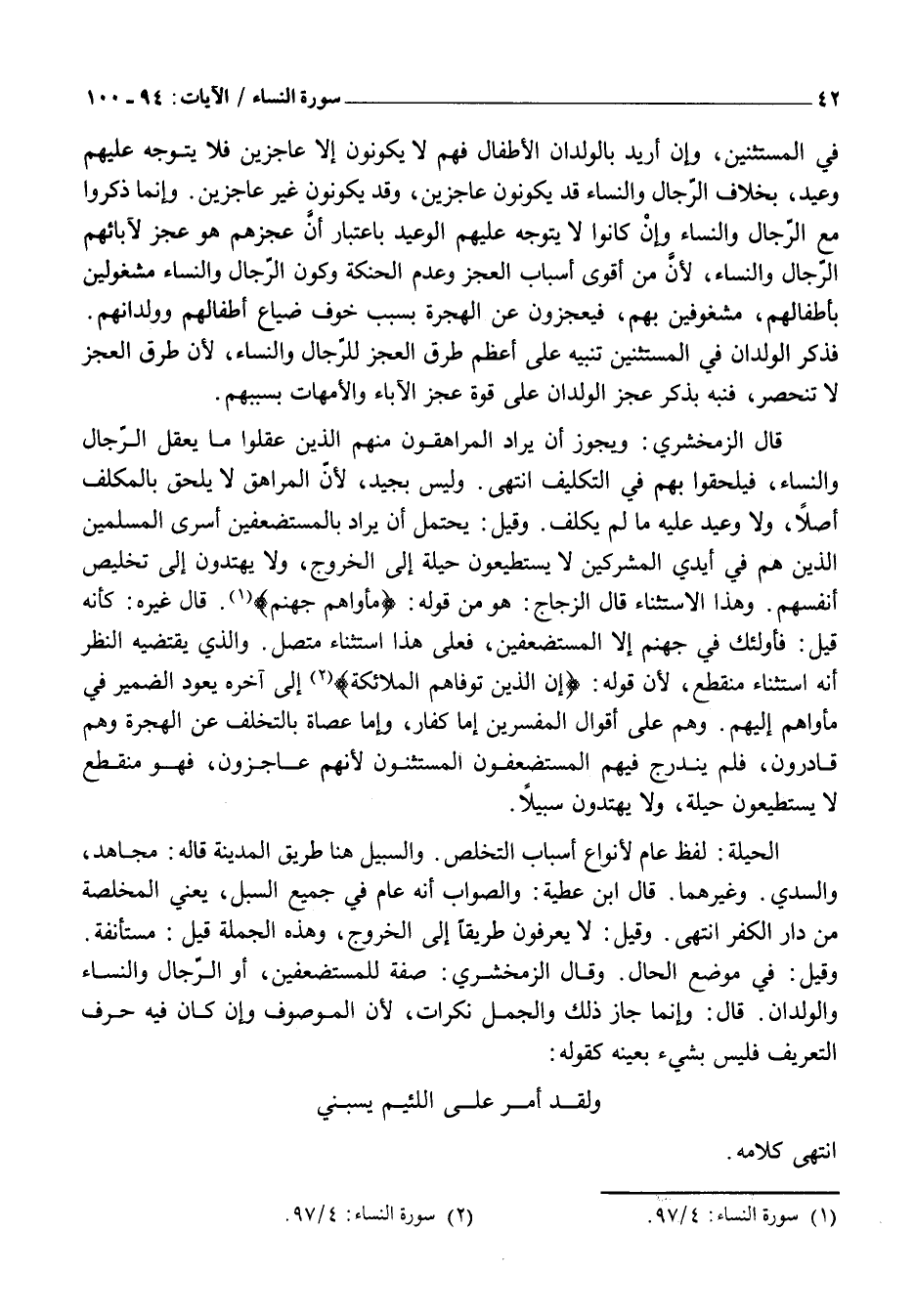 فِي الْمُسْتَثْنَيْنَ، وَإِنْ أُرِيدَ بِالْوِلْدَانِ الْأَطْفَالُ فَهُمْ لَا يَكُونُونَ إِلَّا عَاجِزِينَ فَلَا يَتَوَجَّهُ عَلَيْهِمْ وَعِيدٌ، بِخِلَافِ الرِّجَالِ وَالنِّسَاءِ قَدْ يَكُونُونَ عَاجِزِينَ، وَقَدْ يَكُونُونَ غَيْرَ عَاجِزِينَ. وَإِنَّمَا ذُكِرُوا مَعَ الرِّجَالِ وَالنِّسَاءِ وَإِنْ كَانُوا لَا يَتَوَجَّهُ عَلَيْهِمُ الْوَعِيدُ بِاعْتِبَارِ أَنَّ عَجْزَهُمْ هُوَ عجزهم لِآبَائِهِمُ الرِّجَالِ وَالنِّسَاءِ، لِأَنَّ مِنْ أَقْوَى أَسْبَابِ الْعَجْزِ وعدم الحنكة وكون الرِّجَالِ وَالنِّسَاءِ مَشْغُولِينَ بِأَطْفَالِهِمْ، مَشْغُوفِينَ بِهِمْ، فَيَعْجِزُونَ عَنِ الْهِجْرَةِ بِسَبَبِ خَوْفِ ضَيَاعِ أَطْفَالِهِمْ وَوِلْدَانِهِمْ.