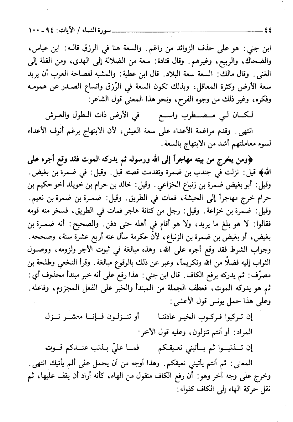 ابْنُ جِنِّيٍّ: هُوَ عَلَى حَذْفِ الزَّوَائِدِ مِنْ رَاغَمَ. وَالسِّعَةُ هُنَا فِي الرِّزْقِ قَالَهُ: ابْنُ عَبَّاسٍ، وَالضَّحَّاكُ، وَالرَّبِيعُ، وَغَيْرُهُمْ. وَقَالَ قَتَادَةُ: سَعَةٌ مِنَ الضَّلَالَةِ إِلَى الْهُدَى، وَمِنَ الْقِلَّةِ إِلَى الْغِنَى. وَقَالَ مَالِكٌ: السِّعَةُ سَعَةُ الْبِلَادِ. قَالَ ابْنُ عَطِيَّةَ: وَالْمُشْبِهُ لِفَصَاحَةِ الْعَرَبِ أَنْ يُرِيدَ سَعَةَ الْأَرْضِ وَكَثْرَةَ الْمَعَاقِلِ، وَبِذَلِكَ تَكُونُ السَّعَةُ فِي الرِّزْقِ وَاتِّسَاعِ الصَّدْرِ عَنْ هُمُومِهِ وَفِكْرِهِ، وَغَيْرِ ذَلِكَ مِنْ وُجُوهِ الْفَرَحِ، وَنَحْوُ هَذَا الْمَعْنَى قَوْلُ الشَّاعِرِ: