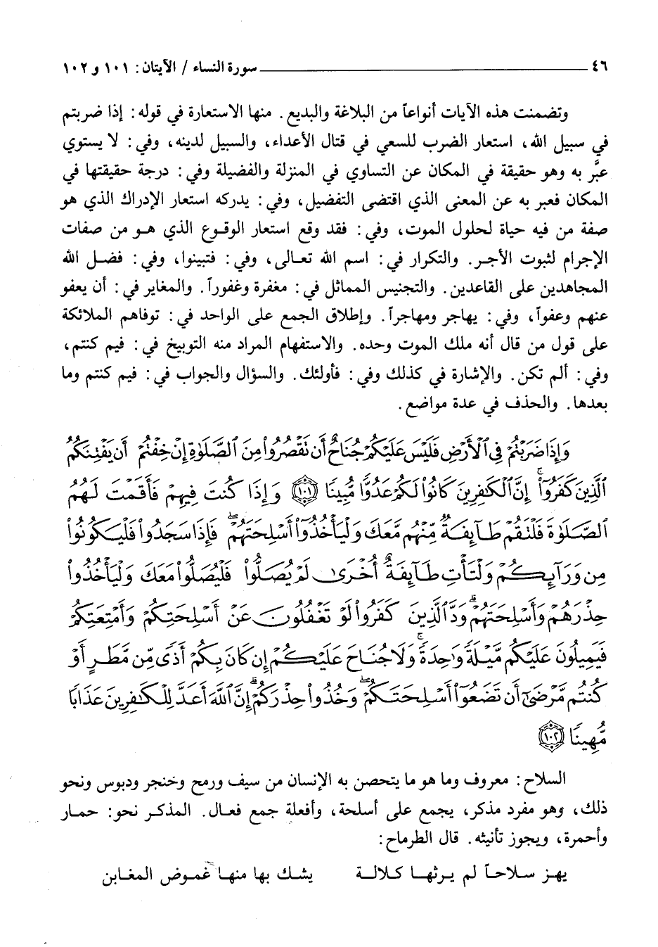 وَإِذا ضَرَبْتُمْ فِي الْأَرْضِ فَلَيْسَ عَلَيْكُمْ جُناحٌ أَنْ تَقْصُرُوا مِنَ الصَّلاةِ إِنْ خِفْتُمْ أَنْ يَفْتِنَكُمُ الَّذِينَ كَفَرُوا إِنَّ الْكافِرِينَ كانُوا لَكُمْ عَدُوًّا مُبِيناً (101) وَإِذا كُنْتَ فِيهِمْ فَأَقَمْتَ لَهُمُ الصَّلاةَ فَلْتَقُمْ طائِفَةٌ مِنْهُمْ مَعَكَ وَلْيَأْخُذُوا أَسْلِحَتَهُمْ فَإِذا سَجَدُوا فَلْيَكُونُوا مِنْ وَرائِكُمْ وَلْتَأْتِ طائِفَةٌ أُخْرى لَمْ يُصَلُّوا فَلْيُصَلُّوا مَعَكَ وَلْيَأْخُذُوا حِذْرَهُمْ وَأَسْلِحَتَهُمْ وَدَّ الَّذِينَ كَفَرُوا لَوْ تَغْفُلُونَ عَنْ أَسْلِحَتِكُمْ وَأَمْتِعَتِكُمْ فَيَمِيلُونَ عَلَيْكُمْ مَيْلَةً واحِدَةً وَلا جُناحَ عَلَيْكُمْ إِنْ كانَ بِكُمْ أَذىً مِنْ مَطَرٍ أَوْ كُنْتُمْ مَرْضى أَنْ تَضَعُوا أَسْلِحَتَكُمْ وَخُذُوا حِذْرَكُمْ إِنَّ اللَّهَ أَعَدَّ لِلْكافِرِينَ عَذاباً مُهِيناً (102)