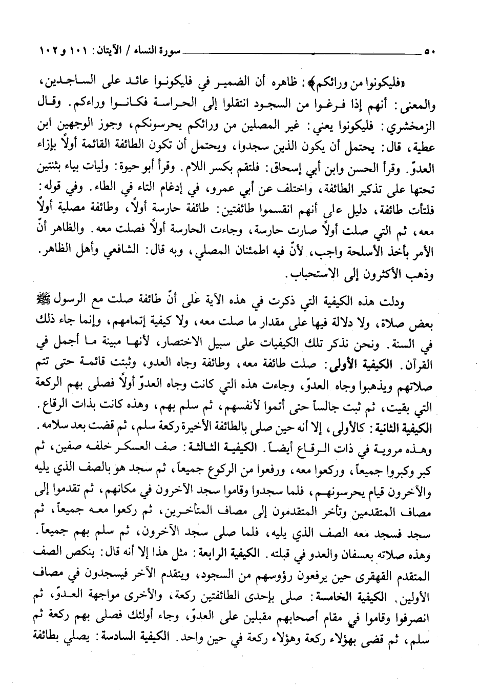 وَدَلَّتْ هَذِهِ الْكَيْفِيَّةُ الَّتِي ذُكِرَتْ فِي هَذِهِ الْآيَةِ عَلَى أَنَّ طَائِفَةً صَلَّتْ مَعَ الرَّسُولِ صَلَّى اللَّهُ عليه وسلم بَعْضَ صَلَاةٍ، وَلَا دَلَالَةَ فِيهَا عَلَى مِقْدَارِ مَا صَلَّتْ مَعَهُ، وَلَا كَيْفِيَّةِ إِتْمَامِهِمْ، وَإِنَّمَا جَاءَ ذَلِكَ فِي السُّنَّةِ. وَنَحْنُ نَذْكُرُ تِلْكَ الْكَيْفِيَّاتِ عَلَى سَبِيلِ الِاخْتِصَارِ، لِأَنَّهَا مُبَيِّنَةٌ مَا أُجْمِلَ فِي الْقُرْآنِ. الْكَيْفِيَّةُ الْأُولَى: صَلَّتْ طَائِفَةٌ مَعَهُ، وَطَائِفَةٌ وُجَاهَ الْعَدُوِّ، وَثَبَتَتْ قَائِمَةً حَتَّى تَتِمَّ صَلَاتُهُمْ وَيَذْهَبُوا وُجَاهَ الْعَدُوِّ، وَجَاءَتْ هَذِهِ الَّتِي كَانَتْ وُجَاهَ الْعَدُوِّ أَوَّلًا فَصَلَّى بِهِمُ الرَّكْعَةَ الَّتِي بَقِيَتْ، ثُمَّ ثَبَتَ جَالِسًا حَتَّى أَتَمُّوا لِأَنْفُسِهِمْ، ثُمَّ سَلَّمَ بِهِمْ، وَهَذِهِ كَانَتْ بِذَاتِ الرِّقَاعِ.