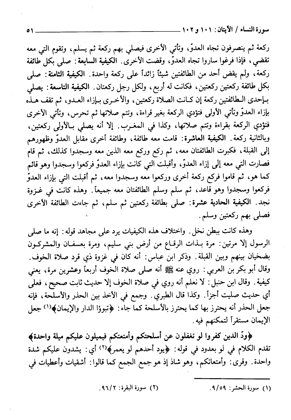 وَهَذِهِ كَانَتْ بِبَطْنِ نَخْلٍ. وَاخْتِلَافُ هَذِهِ الْكَيْفِيَّاتِ يَرُدُّ عَلَى مُجَاهِدٍ قَوْلَهُ: إِنَّهُ مَا صَلَّى الرَّسُولُ إِلَّا مَرَّتَيْنِ: مَرَّةً بِذَاتِ الرِّقَاعِ مِنْ أَرْضِ بَنِي سُلَيْمٍ، وَمُرَّةً بِعُسَفَانَ وَالْمُشْرِكُونَ بِضِخْيَانَ بَيْنَهُمْ وَبَيْنَ الْقِبْلَةِ. وَذَكَرَ ابْنِ عَبَّاسٍ: أَنَّهُ كَانَ فِي غَزْوَةِ ذِي قُرَدٍ صَلَاةُ الْخَوْفِ.