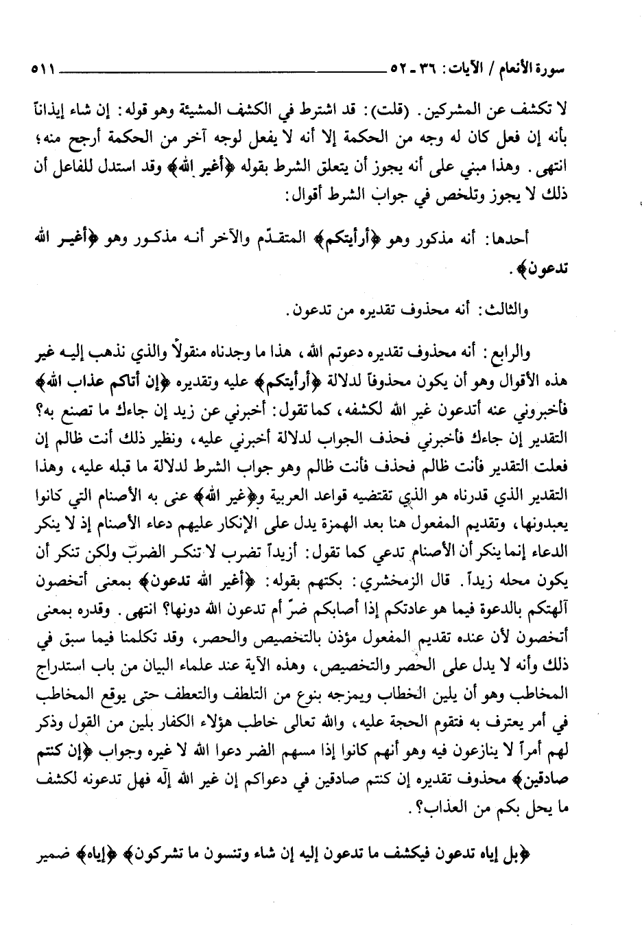 لَا تُكْشَفُ عَنِ الْمُشْرِكِينَ. (قُلْتُ) : قَدِ اشْتَرَطَ فِي الْكَشْفِ الْمَشِيئَةَ وَهُوَ قَوْلُهُ: إِنْ شَاءَ إِيذَانًا بِأَنَّهُ إِنْ فَعَلَ كَانَ لَهُ وَجْهٌ مِنَ الْحِكْمَةِ إِلَّا أَنَّهُ لَا يَفْعَلُ لِوَجْهٍ آخَرَ مِنَ الْحِكْمَةِ أَرْجَحَ مِنْهُ انْتَهَى. وَهَذَا مَبْنِيٌّ عَلَى أَنَّهُ يَجُوزُ أَنْ يَتَعَلَّقَ الشَّرْطُ بِقَوْلِهِ أَغَيْرَ اللَّهِ وَقَدِ اسْتَدَلَّ لِلْفَاعِلِ أَنَّ ذَلِكَ لَا يَجُوزُ وَتُلُخِّصَ فِي جَوَابِ الشَّرْطِ أَقْوَالٌ: