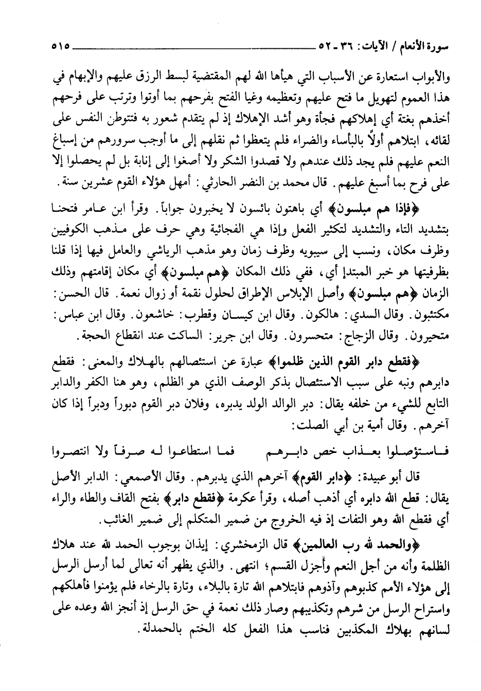 فَقُطِعَ دابِرُ الْقَوْمِ الَّذِينَ ظَلَمُوا عِبَارَةٌ عَنِ اسْتِئْصَالِهِمْ بِالْهَلَاكِ وَالْمَعْنَى: فَقُطِعَ دَابِرُهُمْ وَنَبَّهَ عَلَى سَبَبِ الِاسْتِئْصَالِ بِذِكْرِ الْوَصْفِ الَّذِي هُوَ الظُّلْمُ، وَهُوَ هُنَا الْكُفْرُ وَالدَّابِرُ التَّابِعُ لِلشَّيْءِ مِنْ خَلْفِهِ يُقَالُ: دَبَرَ الْوَالِدَ الْوَلَدُ يَدْبُرُهُ، وَفُلَانٌ دَبَرَ الْقَوْمَ دُبُورًا وَدَبَرًا إِذَا كَانَ آخِرَهُمْ. وَقَالَ أُمَيَّةَ بْنِ أَبِي الصَّلْتِ: