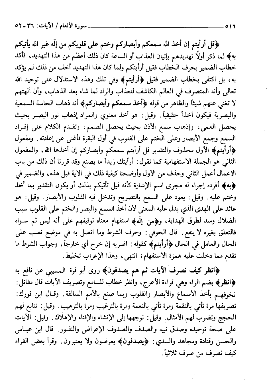 قُلْ أَرَأَيْتُمْ إِنْ أَخَذَ اللَّهُ سَمْعَكُمْ وَأَبْصارَكُمْ وَخَتَمَ عَلى قُلُوبِكُمْ مَنْ إِلهٌ غَيْرُ اللَّهِ يَأْتِيكُمْ بِهِ لَمَّا ذَكَرَ أَوَّلًا تَهْدِيدَهُمْ بِإِتْيَانِ الْعَذَابِ أَوِ السَّاعَةِ كَانَ ذَلِكَ أَعْظَمَ مِنْ هَذَا التَّهْدِيدِ، فَأَكَّدَ خِطَابَ الضَّمِيرِ بِحَرْفِ الْخِطَابِ فَقِيلَ أَرَأَيْتَكُمْ وَلَمَّا كَانَ هَذَا التَّهْدِيدُ أَخَفَّ مِنْ ذَلِكَ لَمْ يُؤَكَّدْ بِهِ، بَلِ اكْتُفِيَ بِخِطَابِ الضَّمِيرِ فَقِيلَ أَرَأَيْتُمْ وَفِي تِلْكَ وَهَذِهِ الِاسْتِدْلَالُ عَلَى تَوْحِيدِ اللَّهِ تَعَالَى وَأَنَّهُ الْمُتَصَرِّفُ فِي الْعَالَمِ الْكَاشِفُ لِلْعَذَابِ وَالرَّادُّ لِمَا شَاءَ بَعْدَ الذَّهَابِ، وَأَنَّ آلِهَتَهُمْ لَا تُغْنِي عَنْهُمْ شَيْئًا وَالظَّاهِرُ مِنْ قَوْلِهِ أَخَذَ اللَّهُ سَمْعَكُمْ وَأَبْصارَكُمْ أَنَّهُ ذَهَابُ الْحَاسَّةِ السَّمْعِيَّةِ وَالْبَصَرِيَّةِ فَيَكُونُ أَخْذًا حَقِيقِيًّا. وَقِيلَ: هُوَ أَخْذٌ مَعْنَوِيٌّ وَالْمُرَادُ إِذْهَابُ نُورِ الْبَصَرِ بِحَيْثُ يَحْصُلُ الْعَمَى، وَإِذْهَابُ سَمْعِ الْأُذُنِ بِحَيْثُ يَحْصُلُ الصَّمَمُ، وَتَقَدَّمَ الْكَلَامُ عَلَى إِفْرَادِ السَّمْعِ وَجَمْعِ الْأَبْصَارِ وَعَلَى الْخَتْمِ عَلَى الْقُلُوبِ فِي أَوَّلِ الْبَقَرَةِ فَأَغْنَى عَنْ إِعَادَتِهِ. وَمَفْعُولُ أَرَأَيْتُمْ الْأَوَّلُ مَحْذُوفٌ وَالتَّقْدِيرُ قُلْ أَرَأَيْتُمْ سَمْعَكُمْ وَأَبْصَارَكُمْ إِنْ أَخَذَهَا اللَّهُ، وَالْمَفْعُولُ الثَّانِي هُوَ الْجُمْلَةُ الِاسْتِفْهَامِيَّةُ كَمَا تَقُولُ: أَرَأَيْتُكَ زَيْدًا مَا يَصْنَعُ وَقَدْ قَرَّرْنَا أَنَّ ذَلِكَ مِنْ بَابِ الْإِعْمَالِ أَعْمَلَ الثَّانِيَ وَحَذَفَ مِنَ الْأَوَّلِ وَأَوْضَحْنَا كَيْفِيَّةَ ذَلِكَ فِي الْآيَةِ قَبْلَ هَذِهِ، وَالضَّمِيرُ فِي بِهِ أَفْرَدَهُ إِجْرَاءً لَهُ مَجْرَى اسْمِ الْإِشَارَةِ كَأَنَّهُ قِيلَ تَأْتِيكُمْ بِذَلِكَ أَوْ يَكُونُ التَّقْدِيرُ بِمَا أَخَذَ وَخَتَمَ عَلَيْهِ. وَقِيلَ: يَعُودُ عَلَى السَّمْعِ بِالتَّصْرِيحِ وَتَدْخُلُ فِيهِ الْقُلُوبُ وَالْأَبْصَارُ. وَقِيلَ: هُوَ عَائِدٌ عَلَى الْهُدَى الَّذِي يَدُلُّ عَلَيْهِ الْمَعْنَى لِأَنَّ أَخْذَ السَّمْعِ وَالْبَصَرِ وَالْخَتْمَ عَلَى الْقُلُوبِ سَبَبُ الضَّلَالِ وسد لطرق الهداية، ومَنْ إِلهٌ اسْتِفْهَامٌ مَعْنَاهُ تَوْقِيفُهُمْ عَلَى أَنَّهُ لَيْسَ ثَمَّ سِوَاهُ فَالتَّعَلُّقُ بِغَيْرِهِ لَا يَنْفَعُ. قَالَ الْحَوْفِيُّ: وَحَرْفُ الشَّرْطِ وَمَا اتَّصَلَ بِهِ فِي مَوْضِعِ نَصْبٍ عَلَى الْحَالِ وَالْعَامِلُ فِي الْحَالِ أَرَأَيْتُمْ كَقَوْلِهِ: اضْرِبْهُ إِنْ خَرَجَ أَيْ خَارِجًا، وَجَوَابُ الشَّرْطِ مَا تَقَدَّمَ مِمَّا دَخَلَتْ عَلَيْهِ هَمْزَةُ الِاسْتِفْهَامِ انْتَهَى، وَهَذَا الْإِعْرَابُ تَخْلِيطٌ.