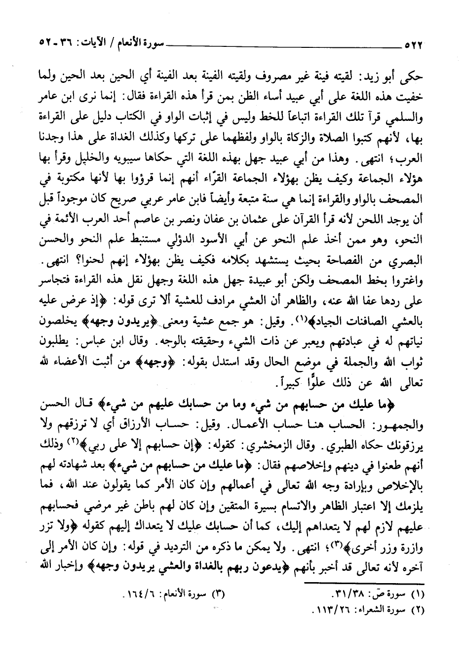 وَاغْتَرُّوا بِخَطِّ الْمُصْحَفِ وَلَكِنْ أَبُو عُبَيْدَةَ جَهِلَ هَذِهِ اللُّغَةَ وَجَهِلَ نَقْلَ هَذِهِ الْقِرَاءَةِ فَتَجَاسَرَ عَلَى رَدِّهَا عَفَا اللَّهُ عَنْهُ، وَالظَّاهِرُ أَنَّ الْعَشِيَّ مُرَادِفٌ لِلْعَشِيَّةِ أَلَا تَرَى قَوْلَهُ: إِذْ عُرِضَ عَلَيْهِ بِالْعَشِيِّ الصَّافِناتُ الْجِيادُ «1» . وَقِيلَ: هُوَ جَمْعُ عَشِيَّةٍ وَمَعْنَى يُرِيدُونَ وَجْهَهُ يُخْلِصُونَ نِيَّاتِهِمْ لَهُ فِي عِبَادَتِهِمْ وَيُعَبَّرُ عَنْ ذَاتِ الشَّيْءِ وَحَقِيقَتِهِ بِالْوَجْهِ. وَقَالَ ابْنُ عَبَّاسٍ: يَطْلُبُونَ ثَوَابَ اللَّهِ وَالْجُمْلَةُ فِي مَوْضِعِ الْحَالِ وَقَدِ اسْتَدَلَّ بِقَوْلِهِ: وَجْهَهُ مَنْ أَثْبَتَ الْأَعْضَاءِ لِلَّهِ تَعَالَى اللَّهُ عَنْ ذَلِكَ عُلُوًّا كَبِيرًا.