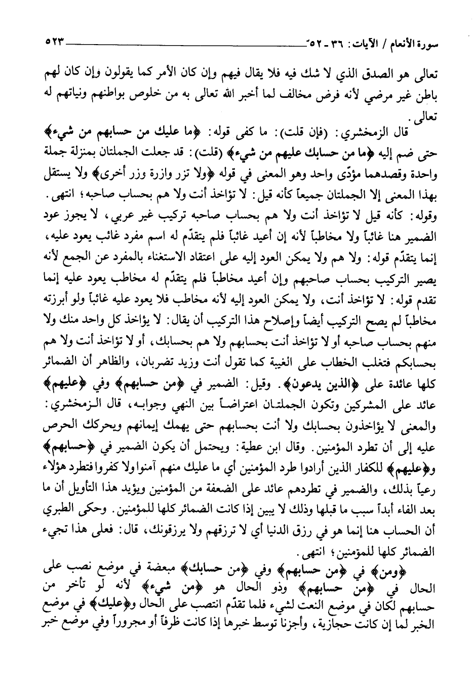 وَالْمَعْنَى لَا يُؤَاخَذُونَ بِحِسَابِكَ وَلَا أَنْتَ بِحِسَابِهِمْ حَتَّى يَهُمَّكَ إِيمَانُهُمْ وَيُحَرِّكَكَ الْحِرْصُ عَلَيْهِ إِلَى أَنْ تَطْرُدَ الْمُؤْمِنِينَ. وَقَالَ ابْنُ عَطِيَّةَ: وَيُحْتَمَلُ أَنْ يَكُونَ الضَّمِيرُ فِي حِسابِهِمْ وعَلَيْهِمْ لِلْكُفَّارِ الَّذِينَ أَرَادُوا طَرْدَ الْمُؤْمِنِينَ أَيْ مَا عَلَيْكَ مِنْهُمْ آمَنُوا وَلَا كَفَرُوا فَتَطْرُدَ هَؤُلَاءِ رَعْيًا بِذَلِكَ، وَالضَّمِيرُ فِي تَطْرُدَهُمْ عَائِدٌ عَلَى الضَّعَفَةِ مِنَ الْمُؤْمِنِينَ وَيُؤَيِّدُ هَذَا التَّأْوِيلَ أَنَّ مَا بَعْدَ الْفَاءِ أَبَدًا سَبَبُ مَا قَبْلَهَا وَذَلِكَ لَا يَبِينُ إِذَا كَانَتِ الضَّمَائِرُ كُلُّهَا لِلْمُؤْمِنِينَ. وَحَكَى الطَّبَرِيُّ أَنَّ الْحِسَابَ هُنَا إِنَّمَا هُوَ فِي رِزْقِ الدُّنْيَا أَيْ لَا تَرْزُقُهُمْ وَلَا يَرْزُقُونَكَ، قَالَ: فَعَلَى هَذَا تَجِيءُ الضَّمَائِرُ كُلُّهَا لِلْمُؤْمِنِينَ انْتَهَى.