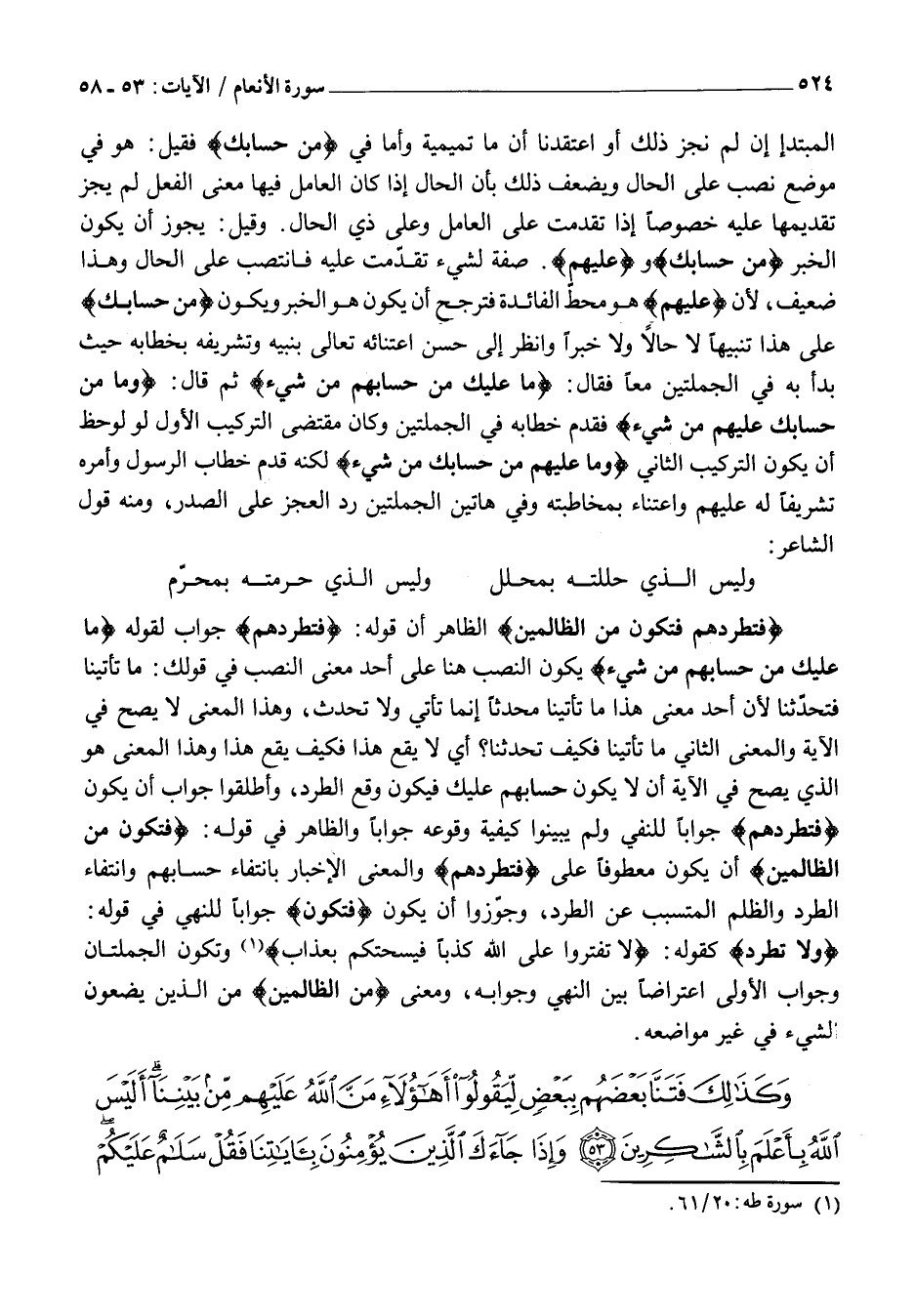 فَتَطْرُدَهُمْ فَتَكُونَ مِنَ الظَّالِمِينَ الظَّاهِرُ أَنَّ قَوْلَهُ: فَتَطْرُدَهُمْ جَوَابٌ لِقَوْلِهِ مَا عَلَيْكَ مِنْ حِسابِهِمْ مِنْ شَيْءٍ يكون النَّصْبُ هُنَا عَلَى أَحَدِ معنى النَّصْبِ فِي قَوْلِكَ: مَا تَأْتِينَا فَتُحَدِّثَنَا لِأَنَّ أَحَدَ معنى هَذَا مَا تَأْتِينَا مُحَدِّثًا إِنَّمَا تَأْتِي وَلَا تُحَدِّثُ، وَهَذَا الْمَعْنَى لَا يَصِحُّ فِي الْآيَةِ وَالْمَعْنَى الثَّانِي مَا تَأْتِينَا فَكَيْفَ تُحَدِّثُنَا؟ أَيْ لَا يَقَعُ هَذَا فَكَيْفَ يَقَعُ هَذَا وَهَذَا الْمَعْنَى هُوَ الَّذِي يَصِحُّ فِي الْآيَةِ أَنْ لَا يَكُونَ حِسَابُهُمْ عَلَيْكَ فَيَكُونَ وَقْعُ الطَّرْدِ، وَأَطْلَقُوا جَوَابَ أَنْ يَكُونَ فَتَطْرُدَهُمْ جَوَابًا لِلنَّفْيِ وَلَمْ يُبَيِّنُوا كَيْفِيَّةَ وُقُوعِهِ جَوَابًا وَالظَّاهِرُ فِي قَوْلِهِ: فَتَكُونَ مِنَ الظَّالِمِينَ أَنْ يَكُونَ مَعْطُوفًا عَلَى فَتَطْرُدَهُمْ وَالْمَعْنَى الْإِخْبَارُ بِانْتِفَاءِ حِسَابِهِمْ وَانْتِفَاءِ الطَّرْدِ وَالظُّلْمِ الْمُتَسَبِّبِ عَنِ الطَّرْدِ، وَجَوَّزُوا أَنْ يَكُونَ فَتَكُونَ جَوَابًا لِلنَّهْيِ فِي قَوْلِهِ: