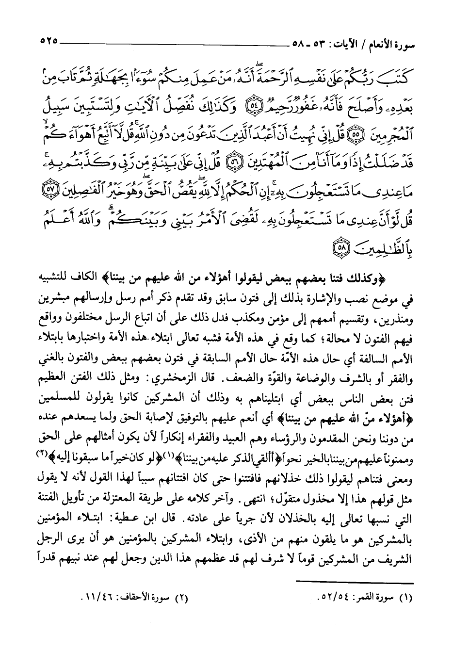 وَكَذلِكَ فَتَنَّا بَعْضَهُمْ بِبَعْضٍ لِيَقُولُوا أَهؤُلاءِ مَنَّ اللَّهُ عَلَيْهِمْ مِنْ بَيْنِنا الْكَافُ لِلتَّشْبِيهِ فِي مَوْضِعِ نَصْبٍ وَالْإِشَارَةُ بِذَلِكَ إِلَى فُتُونٍ سَابِقٍ وَقَدْ تَقَدَّمَ ذِكْرُ أُمَمِ رُسُلٍ وَإِرْسَالِهِمْ مُبَشِّرِينَ وَمُنْذِرِينَ، وَتَقْسِيمِ أُمَمِهِمْ إِلَى مُؤْمِنٍ وَمُكَذِّبٍ فَدَلَّ ذَلِكَ عَلَى أَنَّ أَتْبَاعَ الرُّسُلِ مُخْتَلِفُونَ وَوَاقِعٌ فِيهِمُ الْفُتُونُ لَا مَحَالَةَ كَمَا وَقَعَ فِي هَذِهِ الْأُمَّةِ فَشَبَّهَ تَعَالَى ابْتِلَاءَ هَذِهِ الْأُمَّةِ وَاخْتِبَارَهَا بِابْتِلَاءِ الْأُمَمِ السَّالِفَةِ أَيْ حَالُ هَذِهِ الْأُمَّةِ حَالُ الْأُمَمِ السَّابِقَةِ فِي فُتُونِ بَعْضِهِمْ بِبَعْضٍ وَالْفُتُونُ بِالْغِنَى وَالْفَقْرِ أَوْ بِالشَّرَفِ وَالْوَضَاعَةِ وَالْقُوَّةِ وَالضَّعْفِ. قَالَ الزَّمَخْشَرِيُّ: وَمِثْلُ ذَلِكَ الْفَتْنِ الْعَظِيمِ فَتْنُ بَعْضِ النَّاسِ بِبَعْضٍ أَيِ ابْتَلَيْنَاهُمْ بِهِ وَذَلِكَ أَنَّ الْمُشْرِكِينَ كَانُوا يَقُولُونَ لِلْمُسْلِمِينَ أَهؤُلاءِ مَنَّ اللَّهُ عَلَيْهِمْ مِنْ بَيْنِنا أَيْ أَنْعَمَ عَلَيْهِمْ بِالتَّوْفِيقِ لِإِصَابَةِ الْحَقِّ وَلِمَا يُسْعِدُهُمْ عِنْدَهُ مِنْ دُونِنَا وَنَحْنُ الْمُقَدَّمُونَ وَالرُّؤَسَاءُ وَهُمُ الْعَبِيدُ وَالْفُقَرَاءُ إِنْكَارًا لِأَنْ يَكُونَ أَمْثَالُهُمْ عَلَى الْحَقِّ وَمَمْنُونًا عَلَيْهِمْ مِنْ بَيْنِنَا بِالْخَيْرِ نحوا أَأُلْقِيَ الذِّكْرُ عَلَيْهِ مِنْ بَيْنِنا «1» لَوْ كانَ خَيْراً مَا سَبَقُونا إِلَيْهِ «2» وَمَعْنَى فَتَنَّاهُمْ لِيَقُولُوا ذَلِكَ خِذْلَانُهُمْ فَافْتَتَنُوا حَتَّى كَانَ افْتِتَانُهُمْ سَبَبًا لِهَذَا الْقَوْلِ لِأَنَّهُ لَا يَقُولُ مِثْلَ قَوْلِهِمْ هَذَا إِلَّا مَخْذُولٌ مُتَقَوِّلٌ انْتَهَى. وَآخِرُ كَلَامِهِ عَلَى طَرِيقَةِ الْمُعْتَزِلَةِ مِنْ تَأْوِيلِ الْفِتْنَةِ الَّتِي نَسَبَهَا تَعَالَى إِلَيْهِ بالخذلان لأن جَرْيًا عَلَى عَادَتِهِ. قَالَ ابْنُ عَطِيَّةَ: ابْتِلَاءُ الْمُؤْمِنِينَ بِالْمُشْرِكِينَ هُوَ مَا يَلْقَوْنَ مِنْهُمْ مِنَ الْأَذَى، وَابْتِلَاءُ الْمُشْرِكِينَ بِالْمُؤْمِنِينَ هُوَ أَنْ يَرَى الرَّجُلُ الشَّرِيفُ مِنَ الْمُشْرِكِينَ قَوْمًا لَا شَرَفَ لَهُمْ قَدْ عَظَّمَهُمْ هَذَا الدِّينُ وَجَعَلَ لَهُمْ عِنْدَ نبيهم قدرا
