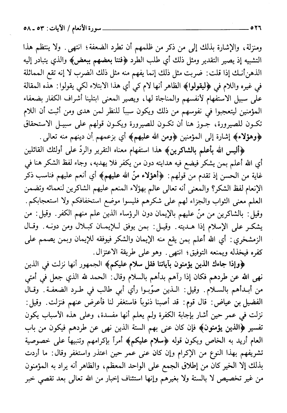 نَزَلَتْ فِي عُمَرَ حِينَ أَشَارَ بِإِجَابَةِ الْكَفَرَةِ وَلَمْ يَعْلَمْ أَنَّهَا مَفْسَدَةٌ، وَعَلَى هَذِهِ الْأَسْبَابِ يَكُونُ تَفْسِيرُ الَّذِينَ يُؤْمِنُونَ فَإِنْ كَانَ عَنَى بِهِمُ السِّتَّةَ الَّذِينَ نَهَى عَنْ طَرْدِهِمْ فَيَكُونُ مِنْ بَابِ الْعَامِّ أُرِيدَ بِهِ الْخَاصُّ وَيَكُونُ قَوْلُهُ سَلامٌ عَلَيْكُمْ أَمْرًا بِإِكْرَامِهِمْ وَتَنْبِيهًا عَلَى خُصُوصِيَّةِ تَشْرِيفِهِمْ بِهَذَا النَّوْعِ مِنَ الْإِكْرَامِ وَإِنْ كَانَ عَنَى عُمَرَ حِينَ اعْتَذَرَ وَاسْتَغْفَرَ وَقَالَ: مَا أَرَدْتُ بِذَلِكَ إِلَّا الْخَيْرَ كَانَ مِنْ إِطْلَاقِ الْجَمْعِ عَلَى الْوَاحِدِ الْمُعَظَّمِ، وَالظَّاهِرُ أَنَّهُ يُرَادُ بِهِ الْمُؤْمِنُونَ مِنْ غَيْرِ تَخْصِيصٍ لَا بِالسِّتَّةِ وَلَا بِغَيْرِهِمْ وَإِنَّهَا اسْتِئْنَافُ إِخْبَارٍ مِنَ اللَّهِ تَعَالَى بَعْدَ تَقَصِّي خَبَرِ