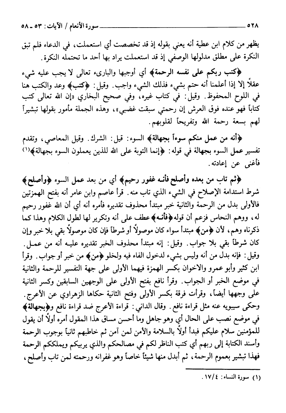 وَحَكَى سِيبَوَيْهِ عَنْهُ مِثْلَ قِرَاءَةِ نَافِعٍ. وَقَالَ الدَّانِي: قِرَاءَةُ الْأَعْرَجِ ضِدُّ قراءة نافع وبِجَهالَةٍ فِي مَوْضِعِ نَصْبٍ عَلَى الْحَالِ أَيْ وَهُوَ جَاهِلٌ وَمَا أَحْسَنَ مَسَاقَ هَذَا الْمَقُولِ أَمَرَهُ أَوَّلًا أَنْ يَقُولَ لِلْمُؤْمِنِينَ سَلَامٌ عَلَيْكُمْ فَبَدَأَ أَوَّلًا بِالسَّلَامَةِ وَالْأَمْنِ لِمَنْ آمَنَ ثُمَّ خَاطَبَهُمْ ثَانِيًا بِوُجُوبِ الرَّحْمَةِ وَأَسْنَدَ الْكِتَابَةَ إِلَى رَبِّهِمْ أَيْ كَتَبَ النَّاظِرُ لَكُمْ فِي مَصَالِحِكُمْ وَالَّذِي يُرَبِّيكُمْ وَيَمْلِكُكُمُ الرَّحْمَةَ فَهَذَا تَبْشِيرٌ بِعُمُومِ الرَّحْمَةِ، ثُمَّ أَبْدَلَ مِنْهَا شَيْئًا خَاصًّا وَهُوَ غُفْرَانُهُ وَرَحْمَتُهُ لِمَنْ تَابَ وَأَصْلَحَ،