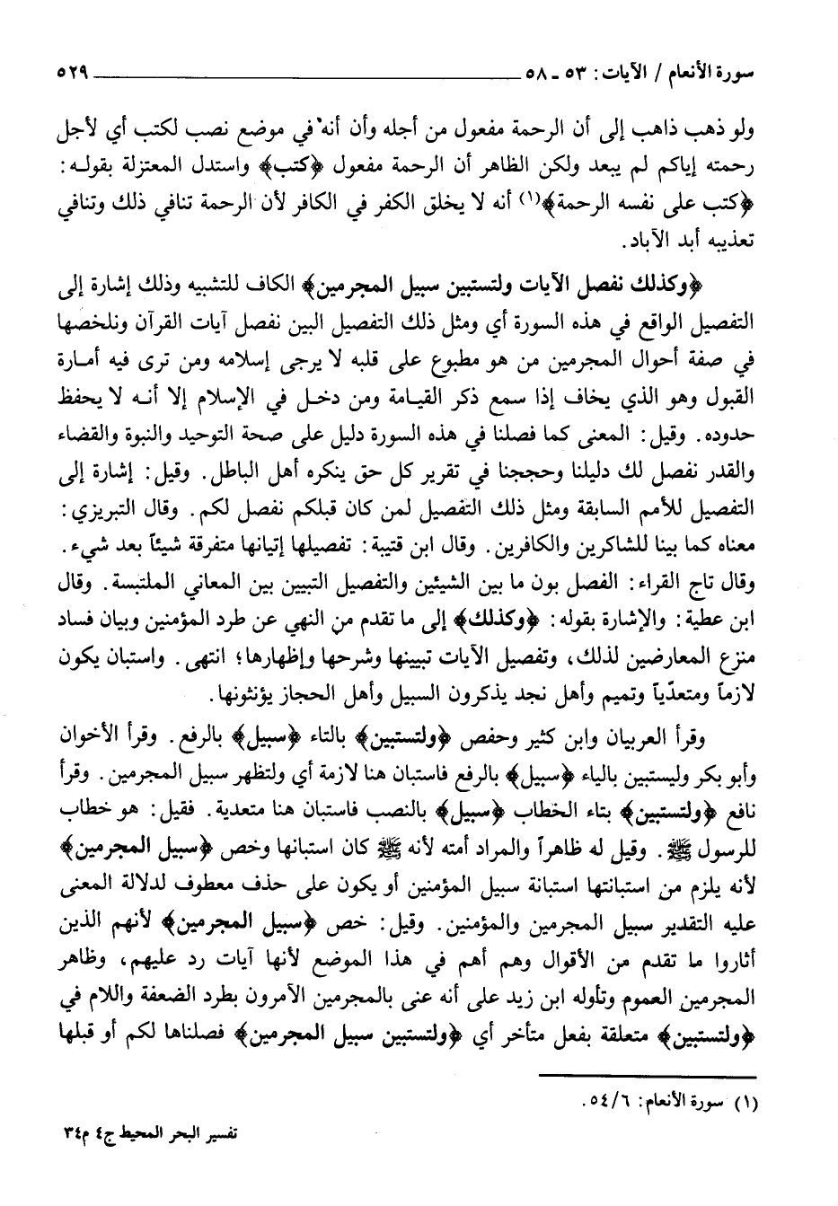 وَقَالَ تَاجُ الْقُرَّاءِ: الْفَصْلُ بَوْنُ مَا بَيْنَ الشَّيْئَيْنِ وَالتَّفْصِيلُ التَّبْيِينُ بَيْنَ الْمَعَانِي الْمُلْتَبِسَةِ. وَقَالَ ابْنُ عَطِيَّةَ: وَالْإِشَارَةُ بِقَوْلِهِ: وَكَذلِكَ إِلَى مَا تَقَدَّمَ مِنَ النَّهْيِ عَنْ طَرْدِ الْمُؤْمِنِينَ وَبَيَانِ فَسَادِ مَنْزَعِ الْمُعَارِضِينَ لِذَلِكَ، وَتَفْصِيلُ الْآيَاتِ تَبْيِينُهَا وَشَرْحُهَا وَإِظْهَارُهَا انْتَهَى. وَاسْتَبَانَ يَكُونُ لَازِمًا وَمُتَعَدِّيًا وَتَمِيمٌ وَأَهْلُ نَجْدٍ يُذَكِّرُونَ السَّبِيلَ وَأَهْلُ الْحِجَازِ يُؤَنِّثُونَهَا.