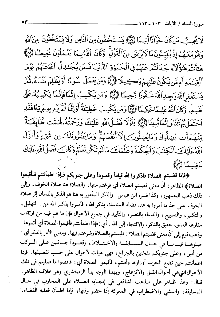 فَإِذا قَضَيْتُمُ الصَّلاةَ فَاذْكُرُوا اللَّهَ قِياماً وَقُعُوداً وَعَلى جُنُوبِكُمْ فَإِذَا اطْمَأْنَنْتُمْ فَأَقِيمُوا الصَّلاةَ الظَّاهِرُ: أَنَّ مَعْنَى قَضَيْتُمُ الصَّلَاةَ أَيَّ فَرَغْتُمْ مِنْهَا، وَالصَّلَاةُ هُنَا صَلَاةُ الْخَوْفِ، وَإِلَى ذَلِكَ ذَهَبَ الْجُمْهُورُ، وَكَذَا فَسَّرَهُ ابْنُ عَبَّاسٍ. وَالذِّكْرُ الْمَأْمُورُ بِهِ هُنَا هُوَ الذِّكْرُ بِاللِّسَانِ إِثْرَ صَلَاةِ الْخَوْفِ عَلَى حَدِّ مَا أُمِرُوا بِهِ عِنْدَ قَضَاءِ الْمَنَاسِكِ بِذِكْرِ اللَّهِ، فَأُمِرُوا بِذِكْرِ اللَّهِ مِنَ: التَّهْلِيلِ، وَالتَّكْبِيرِ، وَالتَّسْبِيحِ، وَالدُّعَاءِ بِالنَّصْرِ، وَالتَّأْيِيدِ فِي جَمِيعِ الْأَحْوَالِ فَإِنَّ مَا هُمْ فِيهِ مِنَ ارْتِقَابِ مُقَارَعَةِ الْعَدُوِّ، حَقِيقٌ بِالذِّكْرِ، وَالِالْتِجَاءِ إِلَى اللَّهِ. أَيْ: فَإِذَا اطْمَأْنَنْتُمْ فَأَقِيمُوا الصَّلَاةَ أَيْ أَتِمُّوهَا.