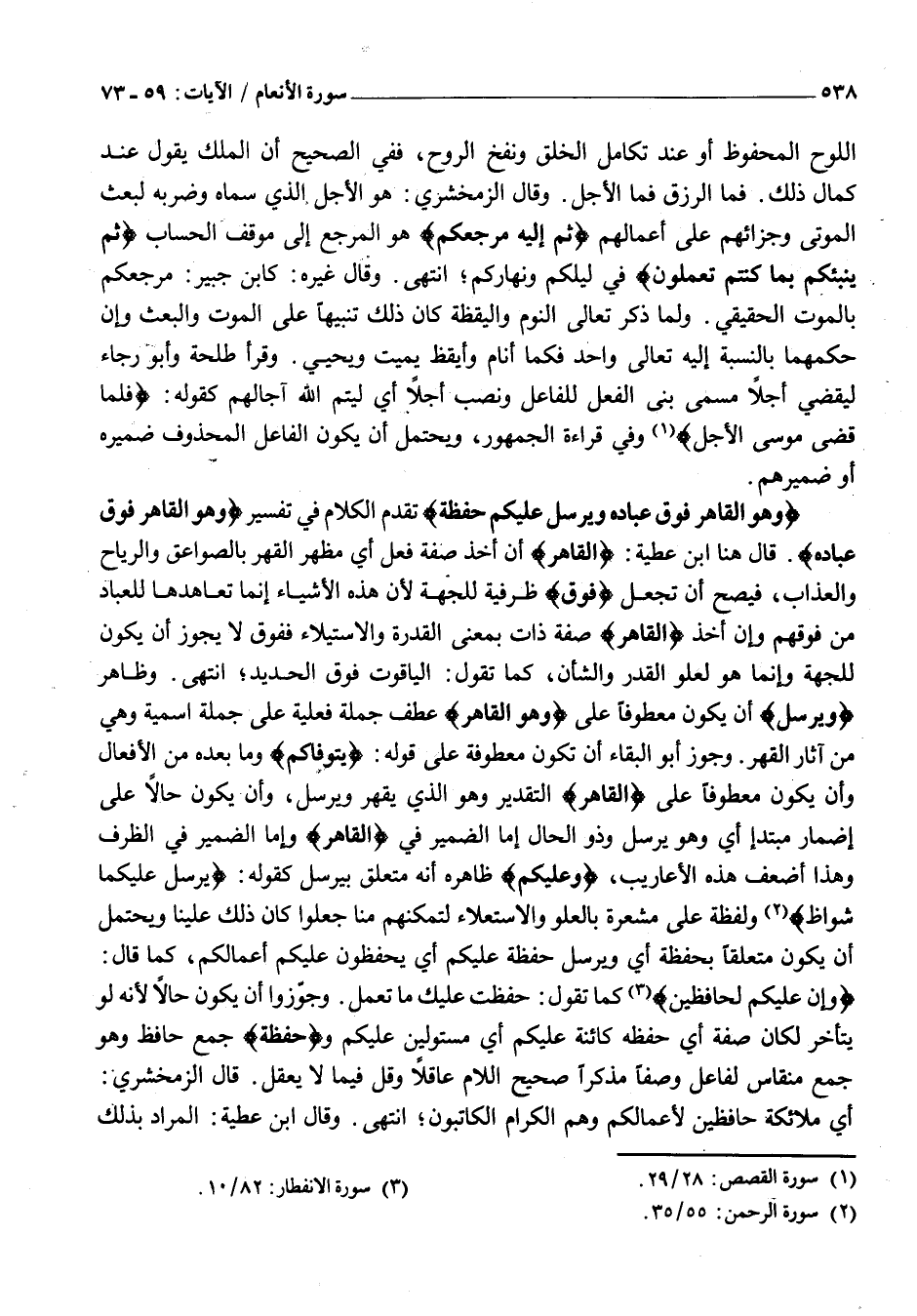 وَهُوَ الْقاهِرُ فَوْقَ عِبادِهِ وَيُرْسِلُ عَلَيْكُمْ حَفَظَةً تَقَدَّمَ الْكَلَامُ فِي تَفْسِيرِ وَهُوَ الْقاهِرُ فَوْقَ عِبادِهِ. قَالَ هُنَا ابْنُ عَطِيَّةَ: الْقاهِرُ إِنْ أَخَذَ صِفَةَ فِعْلٍ أَيْ مُظْهِرُ الْقَهْرِ بِالصَّوَاعِقِ وَالرِّيَاحِ وَالْعَذَابِ، فَيَصِحُّ أَنَّ تُجْعَلَ فَوْقَ ظَرْفِيَّةً لِلْجِهَةِ لِأَنَّ هَذِهِ الْأَشْيَاءَ إِنَّمَا تَعَاهُدُهَا لِلْعِبَادِ مِنْ فَوْقِهِمْ وَإِنْ أَخَذَ الْقاهِرُ صِفَةَ ذَاتٍ بِمَعْنَى الْقُدْرَةِ وَالِاسْتِيلَاءِ فَفَوْقَ لَا يَجُوزُ أَنْ يَكُونَ لِلْجِهَةِ وَإِنَّمَا هُوَ لِعُلُوِّ الْقَدْرِ وَالشَّأْنِ، كَمَا تَقُولُ: الْيَاقُوتُ فَوْقَ الْحَدِيدِ انْتَهَى. وَظَاهِرُ وَيُرْسِلُ أَنْ يَكُونَ مَعْطُوفًا عَلَى وَهُوَ الْقاهِرُ عَطْفَ جُمْلَةٍ فِعْلِيَّةٍ عَلَى جُمْلَةٍ اسْمِيَّةٍ وَهِيَ مِنْ آثَارِ الْقَهْرِ. وَجَوَّزَ أَبُو الْبَقَاءِ أَنْ تَكُونَ مَعْطُوفَةً عَلَى قَوْلِهِ: يَتَوَفَّاكُمْ وَمَا بَعْدَهُ مِنَ الْأَفْعَالِ وَأَنْ يَكُونَ مَعْطُوفًا عَلَى الْقاهِرُ التَّقْدِيرُ وَهُوَ الَّذِي يَقْهَرُ وَيُرْسِلُ، وَأَنْ يَكُونَ حَالًا عَلَى إِضْمَارِ مُبْتَدَأٍ أَيْ وَهُوَ يُرْسِلُ وَذُو الْحَالِ إِمَّا الضَّمِيرُ فِي الْقاهِرُ وَإِمَّا الضَّمِيرُ فِي الظَّرْفِ وَهَذَا أضعف هذه الأعاريب، وَعَلَيْكُمْ ظَاهِرُهُ أَنَّهُ مُتَعَلِّقٌ بِيُرْسِلُ كَقَوْلِهِ: يُرْسَلُ عَلَيْكُما شُواظٌ «2» وَلَفْظَةُ عَلَى مُشْعِرَةٌ بِالْعُلُوِّ وَالِاسْتِعْلَاءِ لِتَمَكُّنِهِمْ مِنَّا جُعِلُوا كَأَنَّ ذَلِكَ عَلَيْنَا وَيُحْتَمَلُ أَنْ يَكُونَ مُتَعَلِّقًا بحفظة أَيْ وَيُرْسِلُ حَفَظَةً عَلَيْكُمْ أَيْ يَحْفَظُونَ عَلَيْكُمْ أَعْمَالَكُمْ، كَمَا قَالَ: