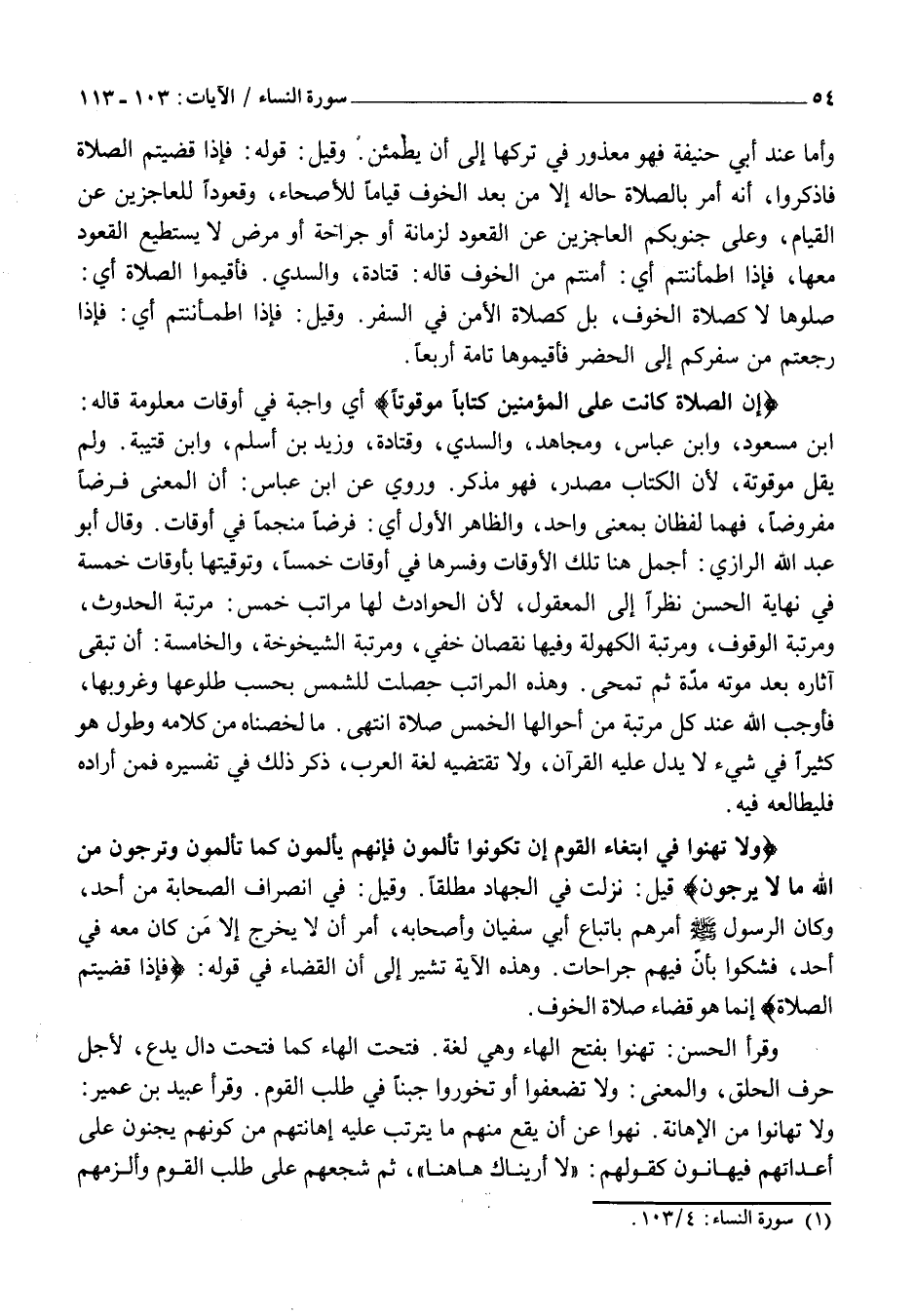 وَلا تَهِنُوا فِي ابْتِغاءِ الْقَوْمِ إِنْ تَكُونُوا تَأْلَمُونَ فَإِنَّهُمْ يَأْلَمُونَ كَما تَأْلَمُونَ وَتَرْجُونَ مِنَ اللَّهِ مَا لَا يَرْجُونَ قِيلَ: نَزَلَتْ فِي الْجِهَادِ مُطْلَقًا. وَقِيلَ: فِي انْصِرَافِ الصَّحَابَةِ مِنْ أُحُدٍ، وَكَانَ الرَّسُولُ صَلَّى اللَّهُ عليه وسلم أَمَرَهُمْ بِاتِّبَاعِ أَبِي سُفْيَانَ وَأَصْحَابِهِ، أَمَرَ أَنْ لَا يَخْرُجَ إِلَّا مَنْ كَانَ مَعَهُ فِي أُحُدٍ، فَشَكَوْا بِأَنَّ فِيهِمْ جِرَاحَاتٍ. وَهَذِهِ الْآيَةُ تُشِيرُ إِلَى أَنَّ الْقَضَاءَ فِي قَوْلِهِ: فَإِذا قَضَيْتُمُ الصَّلاةَ إِنَّمَا هُوَ قَضَاءُ صَلَاةِ الْخَوْفِ.
