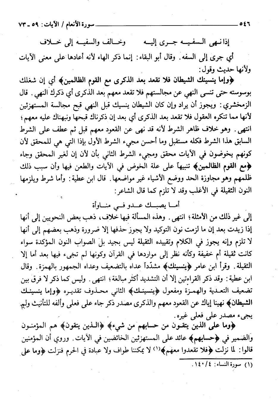 إِمَّا يُصِبْكَ عَدُوٌّ فِي مُنَاوَأَةٍ إِلَى غَيْرِ ذَلِكَ مِنَ الْأَمْثِلَةِ انْتَهَى. وَهَذِهِ الْمَسْأَلَةُ فِيهَا خِلَافٌ، ذَهَبَ بَعْضُ النَّحْوِيِّينَ إِلَى أَنَّهَا إِذَا زِيدَتْ بَعْدَ إِنْ مَا لَزِمَتْ نُونُ التَّوْكِيدِ وَلَا يَجُوزُ حَذْفُهَا إِلَّا ضَرُورَةً وَذَهَبَ بَعْضُهُمْ إِلَى أَنَّهَا لَا تَلْزَمُ وَأَنَّهُ يَجُوزُ فِي الْكَلَامِ وَتَقْيِيدُهُ الثَّقِيلَةَ لَيْسَ بِجَيِّدٍ بَلِ الصَّوَابُ النُّونُ الْمُؤَكَّدَةُ سَوَاءٌ كَانَتْ ثَقِيلَةً أَمْ خَفِيفَةً وَكَأَنَّهُ نَظَرَ إِلَى مَوَارِدِهَا فِي الْقُرْآنِ وَكَوْنِهَا لَمْ تَجِئْ فِيهَا بَعْدَ إِمَّا إِلَّا الثَّقِيلَةُ. وَقَرَأَ ابْنُ عَامِرٍ يُنْسِيَنَّكَ مُشَدَّدًا عَدَّاهُ بِالتَّضْعِيفِ وَعَدَّاهُ الْجُمْهُورُ بِالْهَمْزَةِ. وَقَالَ ابْنُ عَطِيَّةَ: وَقَدْ ذَكَرَ الْقِرَاءَتَيْنِ إِلَّا أَنَّ التَّشْدِيدَ أَكْثَرُ مُبَالَغَةً انْتَهَى. وَلَيْسَ كَمَا ذَكَرَ لَا فَرْقَ بَيْنَ تَضْعِيفِ التَّعْدِيَةِ وَالْهَمْزَةِ وَمَفْعُولُ يُنْسِيَنَّكَ الثَّانِي مَحْذُوفٌ تَقْدِيرُهُ وَإِمَّا يُنْسِيَنَّكَ الشَّيْطانُ نَهْيَنَا إِيَّاكَ عَنِ الْقُعُودِ مَعَهُمْ وَالذِّكْرَى مَصْدَرُ ذَكَرَ جَاءَ عَلَى فُعْلَى وَأَلِفُهُ لِلتَّأْنِيثِ وَلَمْ يَجِئْ مَصْدَرٌ عَلَى فُعْلَى غَيْرُهُ.