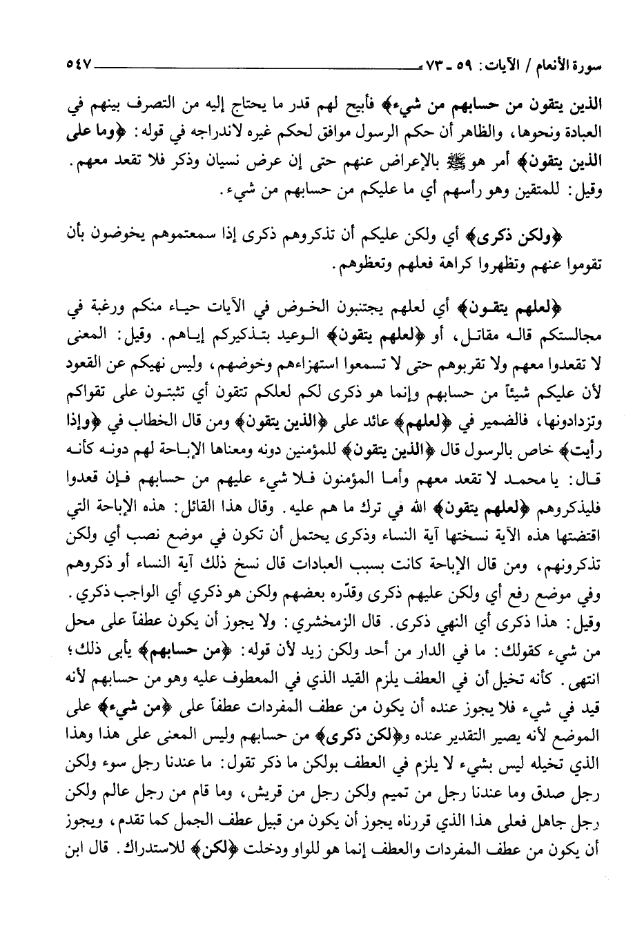 وَقِيلَ: هَذَا ذِكْرَى أَيِ النَّهْيُ ذِكْرَى. قَالَ الزَّمَخْشَرِيُّ: وَلَا يَجُوزُ أَنْ يَكُونَ عَطْفًا عَلَى مَحَلِّ مِنْ شَيْءٍ كَقَوْلِكَ: مَا فِي الدَّارِ مِنْ أَحَدٍ وَلَكِنْ زَيْدٌ لِأَنَّ قَوْلَهُ: مِنْ حِسابِهِمْ يَأْبَى ذَلِكَ انْتَهَى. كَأَنَّهُ تَخَيَّلَ أَنَّ فِي الْعَطْفِ يَلْزَمُ الْقَيْدُ الَّذِي فِي الْمَعْطُوفِ عَلَيْهِ وَهُوَ مِنْ حِسَابِهِمْ لِأَنَّهُ قَيْدٌ فِي شَيْءٍ فَلَا يَجُوزُ عِنْدَهُ أَنْ يَكُونَ مِنْ عَطْفِ الْمُفْرَدَاتِ عَطْفًا عَلَى مِنْ شَيْءٍ عَلَى الْمَوْضِعِ لِأَنَّهُ يَصِيرُ التَّقْدِيرُ عِنْدَهُ ولكِنْ ذِكْرى مِنْ حِسَابِهِمْ وَلَيْسَ الْمَعْنَى عَلَى هَذَا وَهَذَا الَّذِي تَخَيَّلَهُ لَيْسَ بِشَيْءٍ لَا يلزم في العطف بو لكن مَا ذَكَرَ تَقُولُ: مَا عِنْدَنَا رَجُلُ سُوءٍ وَلَكِنْ رَجُلُ صِدْقٍ وَمَا عِنْدَنَا رَجُلٌ مِنْ تَمِيمٍ وَلَكِنْ رَجُلٌ مِنْ قُرَيْشٍ، وَمَا قَامَ مِنْ رَجُلٍ عَالِمٍ وَلَكِنْ رَجُلٍ جَاهِلٍ فَعَلَى هَذَا الَّذِي قَرَّرْنَاهُ يَجُوزُ أَنْ يَكُونَ مِنْ قَبِيلِ عَطْفِ الْجُمَلِ كَمَا تَقَدَّمَ، وَيَجُوزُ أَنْ يَكُونَ مِنْ عَطْفِ الْمُفْرَدَاتِ وَالْعَطْفُ إِنَّمَا هُوَ لِلْوَاوِ وَدَخَلَتْ لكِنْ لِلِاسْتِدْرَاكِ. قَالَ ابْنُ