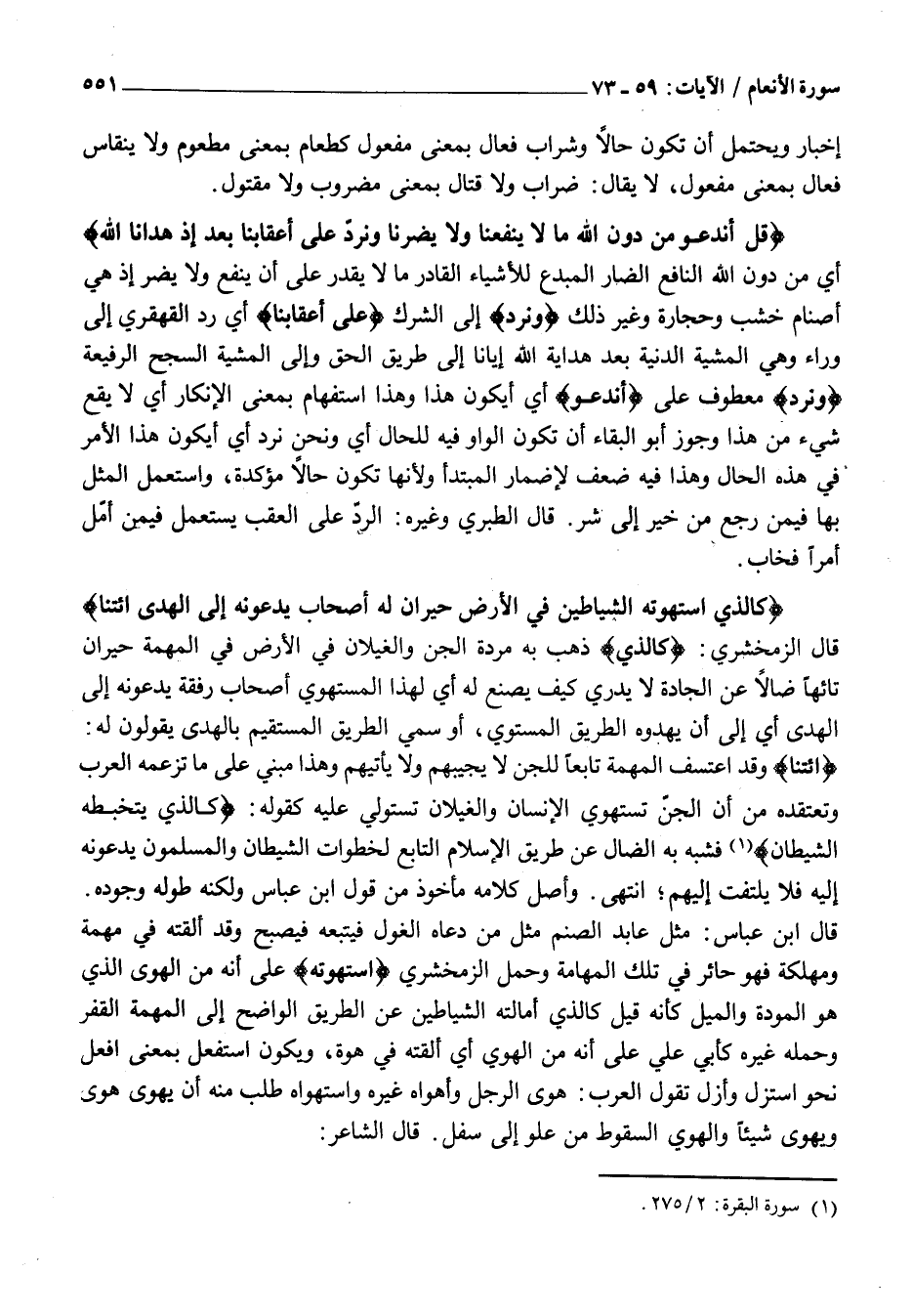 كَالَّذِي اسْتَهْوَتْهُ الشَّياطِينُ فِي الْأَرْضِ حَيْرانَ لَهُ أَصْحابٌ يَدْعُونَهُ إِلَى الْهُدَى ائْتِنا قَالَ الزَّمَخْشَرِيُّ: كَالَّذِي ذَهَبَ بِهِ مَرَدَةُ الْجِنِّ وَالْغِيلَانُ فِي الْأَرْضِ فِي الْمَهْمَهِ حَيْرَانَ تَائِهًا ضَالًّا عَنِ الْجَادَّةِ لَا يَدْرِي كَيْفَ يَصْنَعُ لَهُ أَيْ لِهَذَا الْمُسْتَهْوَى أَصْحَابٌ رُفْقَةٌ يَدْعُونَهُ إِلَى الْهُدَى أَيْ إِلَى أَنْ يَهْدُوهُ الطَّرِيقَ الْمُسْتَوِيَ، أَوْ سُمِّيَ الطَّرِيقُ الْمُسْتَقِيمُ بِالْهُدَى يَقُولُونَ لَهُ: