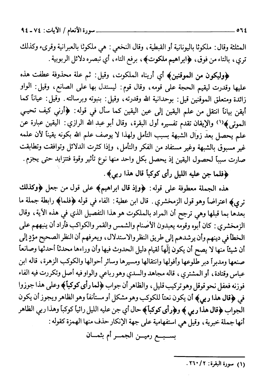 هَذِهِ الْجُمْلَةُ مَعْطُوفَةٌ عَلَى قَوْلِهِ: وَإِذْ قالَ إِبْراهِيمُ عَلَى قَوْلِ مَنْ جَعَلَ وَكَذلِكَ نُرِي اعْتِرَاضًا وَهُوَ قَوْلُ الزَّمَخْشَرِيُّ. قَالَ ابْنُ عَطِيَّةَ: الْفَاءَ فِي قَوْلِهِ فَلَمَّا رَابِطَةٌ جُمْلَةَ مَا بَعْدَهَا بِمَا قَبْلَهَا وَهِيَ تُرَجِّحُ أَنَّ الْمُرَادَ بِالْمَلَكُوتِ هُوَ هَذَا التَّفْصِيلُ الَّذِي فِي هَذِهِ الْآيَةِ، وَقَالَ الزَّمَخْشَرِيُّ: كَانَ أَبُوهُ وَقَوْمُهُ يَعْبُدُونَ الْأَصْنَامَ وَالشَّمْسَ وَالْقَمَرَ وَالْكَوَاكِبَ فَأَرَادَ أَنْ يُنَبِّهَهُمْ عَلَى الْخَطَأِ فِي دِينِهِمْ وَأَنْ يُرْشِدَهُمْ إِلَى طَرِيقِ النَّظَرِ وَالِاسْتِدْلَالِ، وَيُعَرِّفَهُمْ أَنَّ النَّظَرَ الصَّحِيحَ مُؤَدٍّ إِلَى أَنَّ شَيْئًا مِنْهَا لَا يَصِحُّ أَنْ يَكُونَ إِلَهًا لِقِيَامِ دَلِيلِ الْحُدُوثِ فِيهَا وَأَنَّ وَرَاءَهَا مُحْدِثًا أَحْدَثَهَا وَصَانِعًا صَنَعَهَا وَمُدَبِّرًا دَبَّرَ طُلُوعَهَا وَأُفُولَهَا وَانْتِقَالَهَا وَمَسِيرَهَا وَسَائِرَ أَحْوَالِهَا وَالْكَوْكَبُ الزُّهْرَةُ، قَالَهُ ابْنُ عَبَّاسٍ وَقَتَادَةُ، أَوِ الْمُشْتَرِي، قَالَهُ مُجَاهِدٌ وَالسُّدِّيُّ وَهُوَ رُبَاعِيٌّ وَالْوَاوُ فِيهِ أَصْلٌ وَتَكَرَّرَتْ فِيهِ الْفَاءُ فَوَزْنُهُ فَعْفَلٌ نَحْوَ قَوْقَلٍ وَهُوَ تَرْكِيبٌ قَلِيلٌ، وَالظَّاهِرُ أَنَّ جَوَابَ لَمَّا رَأى كَوْكَباً وَعَلَى هَذَا جَوَّزُوا فِي قالَ هَذَا رَبِّي أَنْ يَكُونَ نَعْتًا لِلْكَوْكَبِ وَهُوَ مُشْكِلٌ أَوْ مُسْتَأْنَفًا وَهُوَ الظَّاهِرُ وَيَجُوزُ أَنْ يَكُونَ الْجَوَابُ قالَ هذا رَبِّي ورَأى كَوْكَباً حَالٌ أَيْ جَنَّ عَلَيْهِ اللَّيْلُ رَائِيًا كَوْكَبًا وهذا رَبِّي الظَّاهِرُ أَنَّهَا جُمْلَةٌ خَبَرِيَّةٌ، وَقِيلَ هِيَ اسْتِفْهَامِيَّةٌ عَلَى جِهَةِ الْإِنْكَارِ حُذِفَ مِنْهَا الْهَمْزَةُ كَقَوْلِهِ: