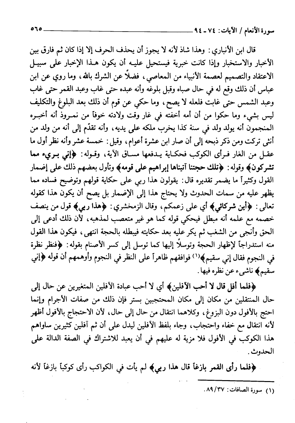 فَلَمَّا أَفَلَ قالَ لَا أُحِبُّ الْآفِلِينَ أَيْ لَا أُحِبُّ عِبَادَةَ الْآفِلِينَ الْمُتَغَيِّرِينَ عَنْ حَالٍ إِلَى حَالٍ الْمُنْتَقِلِينَ مِنْ مَكَانٍ إِلَى مَكَانٍ الْمُحْتَجِبِينَ بِسَتْرٍ فَإِنَّ ذَلِكَ مِنْ صِفَاتِ الْأَجْرَامِ وَإِنَّمَا احْتَجَّ بِالْأُفُولِ دُونَ الْبُزُوغِ، وَكِلَاهُمَا انْتِقَالٌ مِنْ حَالٍ إِلَى حَالٍ، لِأَنَّ الِاحْتِجَاجَ بِالْأُفُولِ أَظْهَرُ لِأَنَّهُ انْتِقَالٌ مَعَ خَفَاءٍ وَاحْتِجَابٍ، وَجَاءَ بِلَفْظِ الْآفِلِينَ لِيَدُلَّ عَلَى أَنَّ ثَمَّ آفِلِينَ كَثِيرِينَ سَاوَاهُمْ هَذَا الْكَوْكَبُ فِي الْأُفُولِ فَلَا مَزِيَّةَ لَهُ عَلَيْهِمْ فِي أَنْ يُعْبَدَ لِلِاشْتِرَاكِ فِي الصِّفَةِ الدَّالَّةِ عَلَى الْحُدُوثِ.