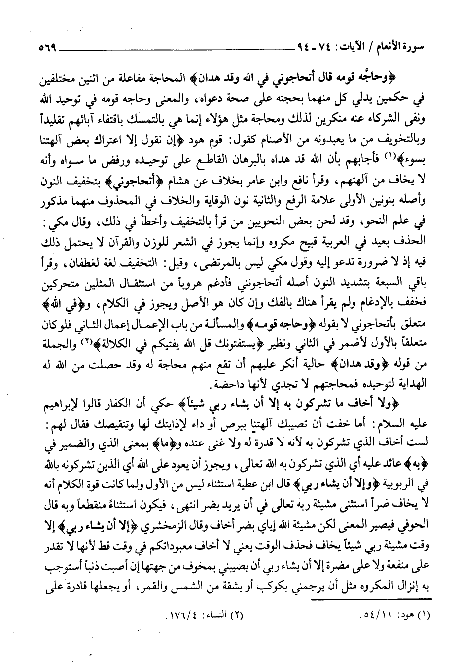 وَحاجَّهُ قَوْمُهُ قالَ أَتُحاجُّونِّي فِي اللَّهِ وَقَدْ هَدانِ الْمُحَاجَّةُ مُفَاعَلَةٌ مِنِ اثْنَيْنِ مُخْتَلِفَيْنِ فِي حُكْمَيْنِ يُدْلِي كُلٌّ مِنْهُمَا بِحُجَّتِهِ عَلَى صِحَّةِ دَعْوَاهُ، وَالْمَعْنَى وَحَاجَّهُ قَوْمُهُ فِي تَوْحِيدِ اللَّهِ وَنَفْيِ الشُّرَكَاءِ عَنْهُ مُنْكِرِينَ لِذَلِكَ وَمُحَاجَّةُ مِثْلِ هَؤُلَاءِ إِنَّمَا هِيَ بِالتَّمَسُّكِ بِاقْتِفَاءِ آبَائِهِمْ تَقْلِيدًا وَبِالتَّخْوِيفِ مِنْ مَا يَعْبُدُونَهُ مِنَ الْأَصْنَامِ كَقَوْلِ: قَوْمِ هُودٍ إِنْ نَقُولُ إِلَّا اعْتَراكَ بَعْضُ آلِهَتِنا بِسُوءٍ «1» فَأَجَابَهُمْ بِأَنَّ اللَّهَ قَدْ هَدَاهُ بِالْبُرْهَانِ الْقَاطِعِ عَلَى تَوْحِيدِهِ وَرَفْضِ مَا سِوَاهُ وَأَنَّهُ لَا يَخَافُ مِنْ آلِهَتِهِمْ، وَقَرَأَ نَافِعٌ وَابْنُ عَامِرٍ بِخِلَافٍ عَنْ هِشَامٍ أَتُحاجُّونِّي بِتَخْفِيفِ النُّونِ وَأَصْلُهُ بِنُونَيْنِ الْأُولَى عَلَامَةُ الرَّفْعِ وَالثَّانِيَةُ نُونُ الْوِقَايَةِ وَالْخِلَافُ فِي الْمَحْذُوفِ مِنْهُمَا مَذْكُورٌ فِي عِلْمِ النَّحْوِ، وَقَدْ لَحَّنَ بَعْضُ النَّحْوِيِّينَ مَنْ قَرَأَ بِالتَّخْفِيفِ وَأَخْطَأَ فِي ذَلِكَ، وَقَالَ مَكِّيٌّ: