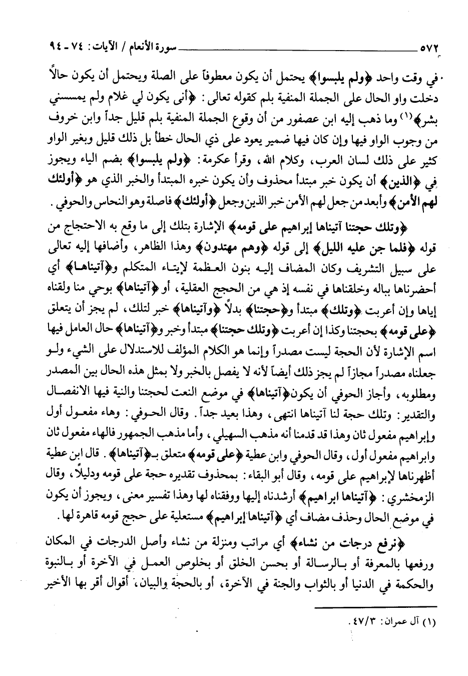 وَتِلْكَ حُجَّتُنا آتَيْناها إِبْراهِيمَ عَلى قَوْمِهِ الإشارة بتلك إِلَى مَا وَقَعَ بِهِ الِاحْتِجَاجُ مِنْ قَوْلِهِ فَلَمَّا جَنَّ عَلَيْهِ اللَّيْلُ إِلَى قَوْلِهِ وَهُمْ مُهْتَدُونَ وَهَذَا الظَّاهِرُ، وَأَضَافَهَا إِلَيْهِ تَعَالَى عَلَى سَبِيلِ التَّشْرِيفِ وَكَانَ المضاف إليه بنون العظمة لإيتاء المتكلم وآتَيْناها أَيْ أَحْضَرْنَاهَا بِبَالِهِ وَخَلَقْنَاهَا فِي نَفْسِهِ إِذْ هِيَ مِنَ الْحُجَجِ الْعَقْلِيَّةِ، أَوْ آتَيْناها بِوَحْيٍ مِنَّا وَلَقَّنَّاهُ إِيَّاهَا وَإِنْ أُعْرِبَتْ وَتِلْكَ مبتدأ وحُجَّتُنا بدلا وآتَيْناها خبر لِتِلْكَ، لَمْ يَجُزْ أَنْ يتعلق عَلى قَوْمِهِ بحجتنا وَكَذَا إِنْ أُعْرِبَتْ وَتِلْكَ حُجَّتُنا مبتدأ وخبر وآتَيْناها حال الْعَامِلُ فِيهَا اسْمُ الْإِشَارَةِ لِأَنَّ الْحُجَّةَ لَيْسَتْ مَصْدَرًا وَإِنَّمَا هُوَ الْكَلَامُ الْمُؤَلَّفُ لِلِاسْتِدْلَالِ عَلَى الشَّيْءِ وَلَوْ جَعَلْنَاهُ مَصْدَرًا مَجَازًا لَمْ يَجُزْ ذَلِكَ أَيْضًا لِأَنَّهُ لَا يُفْصَلُ بِالْخَبَرِ وَلَا بِمِثْلِ هَذِهِ الْحَالِ بَيْنَ الْمَصْدَرِ وَمَطْلُوبِهِ، وَأَجَازَ الْحَوْفِيُّ أَنْ يَكُونَ آتَيْناها فِي مَوْضِعِ النَّعْتِ لِحُجَّتِنَا وَالنِّيَّةُ فِيهَا الِانْفِصَالُ وَالتَّقْدِيرُ: وَتِلْكَ حُجَّةٌ لَنَا آتَيْنَاهَا انْتَهَى، وَهَذَا بَعِيدٌ جِدًّا. وَقَالَ الحوفي: وهاء مفعول أول وإبراهيم مَفْعُولٌ ثَانٍ وَهَذَا قَدْ قَدَّمْنَا أَنَّهُ مَذْهَبُ السُّهَيْلِيِّ: وَأَمَّا مَذْهَبُ الْجُمْهُورِ فَالْهَاءُ مفعول ثان وابراهيم مَفْعُولٌ أَوَّلُ، وَقَالَ الْحَوْفِيُّ وَابْنُ عَطِيَّةَ عَلى قَوْمِهِ مُتَعَلِّقٌ بِ آتَيْناها. قَالَ ابْنُ عَطِيَّةَ أَظْهَرْنَاهَا لِإِبْرَاهِيمَ عَلَى قَوْمِهِ، وَقَالَ أَبُو الْبَقَاءِ: بِمَحْذُوفٍ تَقْدِيرُهُ حُجَّةً عَلَى قَوْمِهِ وَدَلِيلًا، وَقَالَ الزَّمَخْشَرِيُّ: آتَيْناها إِبْراهِيمَ أَرْشَدْنَاهُ إِلَيْهَا وَوَفَّقْنَاهُ لَهَا وَهَذَا تَفْسِيرُ مَعْنًى، وَيَجُوزُ أَنْ يَكُونَ فِي مَوْضِعِ الْحَالِ وَحَذْفِ مُضَافٍ أَيْ آتَيْناها إِبْراهِيمَ مُسْتَعْلِيَةً عَلَى حُجَجِ قَوْمِهِ قَاهِرَةً لَهَا.