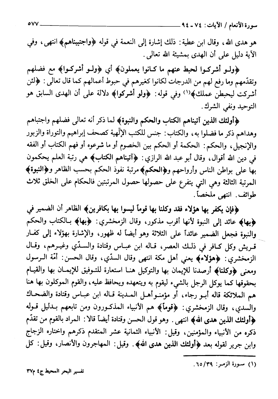 وَلَوْ أَشْرَكُوا لَحَبِطَ عَنْهُمْ مَا كانُوا يَعْمَلُونَ أَيْ وَلَوْ أَشْرَكُوا مَعَ فَضْلِهِمْ وَتَقَدُّمِهِمْ وَمَا رُفِعَ لَهُمْ مِنَ الدَّرَجَاتِ لَكَانُوا كَغَيْرِهِمْ فِي حُبُوطِ أَعْمَالِهِمْ كَمَا قَالَ تَعَالَى: لَئِنْ أَشْرَكْتَ لَيَحْبَطَنَّ عَمَلُكَ «1» وَفِي قَوْلِهِ: وَلَوْ أَشْرَكُوا دَلَالَةٌ عَلَى أَنَّ الْهُدَى السَّابِقَ هُوَ التَّوْحِيدُ وَنَفْيُ الشِّرْكِ.