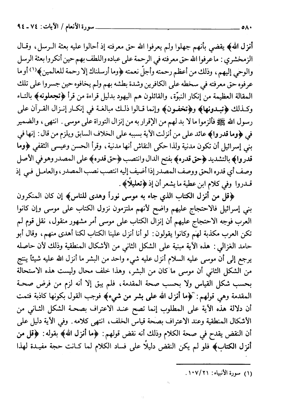 قُلْ مَنْ أَنْزَلَ الْكِتابَ الَّذِي جاءَ بِهِ مُوسى نُوراً وَهُدىً لِلنَّاسِ إِنْ كَانَ الْمُنْكِرُونَ بَنِي إِسْرَائِيلَ فَالِاحْتِجَاجُ عَلَيْهِمْ وَاضِحٌ لِأَنَّهُمْ مُلْتَزِمُونَ نُزُولَ الْكِتَابِ عَلَى مُوسَى وَإِنْ كَانُوا الْعَرَبَ فَوَجْهُ الِاحْتِجَاجِ عَلَيْهِمْ أَنَّ إِنْزَالَ الْكِتَابِ عَلَى مُوسَى أَمْرٌ مَشْهُورٌ مَنْقُولٌ، نَقْلَ قَوْمٍ لَمْ تَكُنِ الْعَرَبُ مُكَذِّبَةً لَهُمْ وَكَانُوا يَقُولُونَ: لو أنا أنزل علينا الْكِتَابُ لَكُنَّا أَهْدَى مِنْهُمْ، وَقَالَ أَبُو حَامِدٍ الْغَزَّالِيُّ: هَذِهِ الْآيَةُ مَبْنِيَّةٌ عَلَى الشَّكْلِ الثَّانِي مِنَ الْأَشْكَالِ الْمَنْطِقِيَّةِ وَذَلِكَ لِأَنَّ حَاصِلَهُ يَرْجِعُ إِلَى أَنَّ مُوسَى عَلَيْهِ السَّلَامُ أُنْزِلَ عَلَيْهِ شَيْءٌ وَاحِدٌ مِنَ الْبَشَرِ مَا أَنْزَلَ اللَّهُ عَلَيْهِ شَيْئًا يَنْتِجُ مِنَ الشَّكْلِ الثَّانِي أَنَّ مُوسَى مَا كَانَ مِنَ الْبَشَرِ، وَهَذَا خَلْفٌ مُحَالٌ وَلَيْسَتْ هَذِهِ الِاسْتِحَالَةُ بِحَسْبَ شَكْلِ الْقِيَاسِ وَلَا بِحَسْبِ صِحَّةِ الْمُقَدِّمَةِ، فَلَمْ يَبْقَ إِلَّا أَنَّهُ لَزِمَ مِنْ فَرْضِ صِحَّةِ الْمُقَدِّمَةِ وَهِيَ قَوْلُهُمْ: مَا أَنْزَلَ اللَّهُ عَلى بَشَرٍ مِنْ شَيْءٍ فَوَجَبَ الْقَوْلُ بِكَوْنِهَا كَاذِبَةٌ فَتَمُتُّ أَنَّ دَلَالَةَ هَذِهِ الْآيَةِ عَلَى الْمَطْلُوبِ إِنَّمَا تَصِحُّ عِنْدَ الِاعْتِرَافِ بِصِحَّةِ الشَّكْلِ الثَّانِي مِنَ الْأَشْكَالِ الْمَنْطِقِيَّةِ وَعِنْدَ الِاعْتِرَافِ بِصِحَّةِ قِيَاسِ الْخَلْفِ، انْتَهَى كَلَامُهُ. وَفِي الْآيَةِ دَلِيلٌ عَلَى أَنَّ النَّقْضَ يَقْدَحُ فِي صِحَّةِ الْكَلَامِ وَذَلِكَ أَنَّهُ نَقَضَ قَوْلَهُمْ: مَا أَنْزَلَ اللَّهُ بِقَوْلِهِ: قُلْ مَنْ أَنْزَلَ الْكِتابَ فَلَوْ لَمْ يَكُنِ النَّقْضُ دَلِيلًا عَلَى فَسَادِ الْكَلَامِ لَمَا كَانَتْ حُجَّةً مُفِيدَةً لهذا