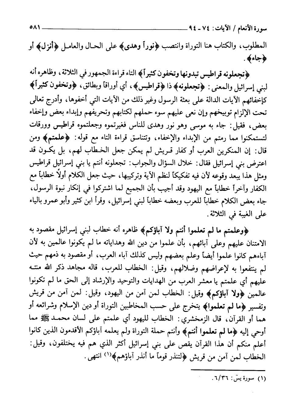 تَجْعَلُونَهُ قَراطِيسَ تُبْدُونَها وَتُخْفُونَ كَثِيراً التَّاءُ قِرَاءَةُ الْجُمْهُورِ فِي الثَّلَاثَةِ، وَظَاهِرُهُ أَنَّهُ لِبَنِي إِسْرَائِيلَ وَالْمَعْنَى: تَجْعَلُونَهُ ذَا قَراطِيسَ، أَيْ أَوْرَاقًا وَبَطَائِقَ، وَتُخْفُونَ كَثِيراً كَإِخْفَائِهِمُ الْآيَاتِ الدَّالَّةِ عَلَى بِعْثَةِ الرَّسُولِ وَغَيْرَ ذَلِكَ مِنَ الْآيَاتِ الَّتِي أَخْفَوْهَا، وَأَدْرَجَ تَعَالَى تَحْتَ الْإِلْزَامِ تَوْبِيخَهُمْ وَإِنْ نَعَى عَلَيْهِمْ سُوءَ حَمْلِهِمْ لِكِتَابِهِمْ وَتَحْرِيفَهُمْ وَإِبْدَاءَ بَعْضٍ وَإِخْفَاءَ بَعْضٍ، فَقِيلَ: جَاءَ بِهِ مُوسَى وَهُوَ نُورٌ وَهُدًى لِلنَّاسِ فَغَيَّرْتُمُوهُ وَجَعَلْتُمُوهُ قَرَاطِيسَ وَوَرَقَاتٍ لِتَسْتَمْكِنُوا مِمَّا رُمْتُمْ مِنَ الْإِبْدَاءِ وَالْإِخْفَاءِ، وَتَتَنَاسَقُ قِرَاءَةُ التَّاءِ مَعَ قَوْلِهِ: عُلِّمْتُمْ وَمَنْ قَالَ: إِنَّ الْمُنْكِرِينَ الْعَرَبُ أَوْ كُفَّارُ قُرَيْشٍ لَمْ يُمْكِنْ جَعْلُ الْخِطَابِ لَهُمْ، بَلْ يَكُونُ قَدِ اعْتَرَضَ بَنِي إِسْرَائِيلَ فَقَالَ: خِلَالَ السُّؤَالِ وَالْجَوَابِ: تَجْعَلُونَهُ أَنْتُمْ يَا بَنِي إِسْرَائِيلَ قَرَاطِيسَ وَمِثْلُ هَذَا يَبْعُدُ وُقُوعُهُ لِأَنَّ فِيهِ تَفْكِيكًا لِنَظْمِ الْآيَةِ وَتَرْكِيبِهَا، حَيْثُ جَعَلَ الْكَلَامَ أَوَّلًا خِطَابًا مَعَ الْكُفَّارِ وَآخِرًا خِطَابًا مَعَ الْيَهُودِ وَقَدْ أُجِيبَ بِأَنَّ الْجَمِيعَ لَمَّا اشْتَرَكُوا فِي إِنْكَارِ نُبُوَّةِ الرَّسُولِ، جَاءَ بَعْضُ الْكَلَامِ خِطَابًا لِلْعَرَبِ وَبَعْضُهُ خَطَابًا لِبَنِي إِسْرَائِيلَ، وَقَرَأَ ابْنُ كَثِيرٍ وَأَبُو عَمْرٍو بِالْيَاءِ عَلَى الْغَيْبَةِ فِي الثَّلَاثَةِ.